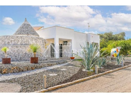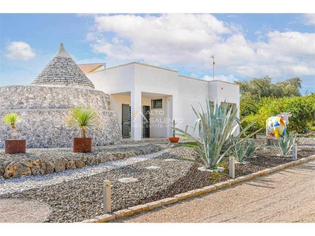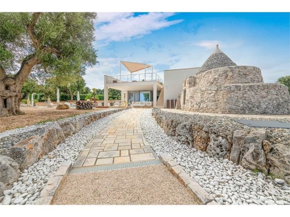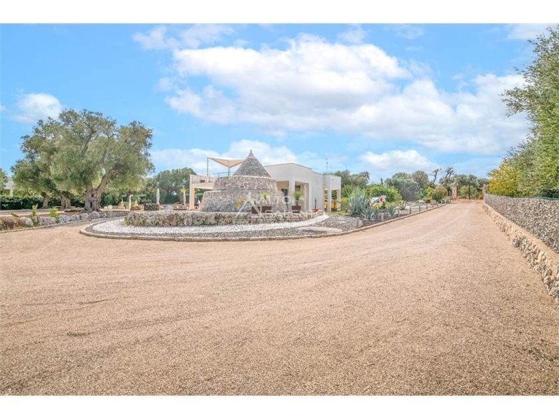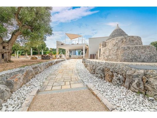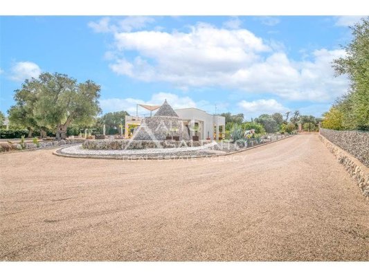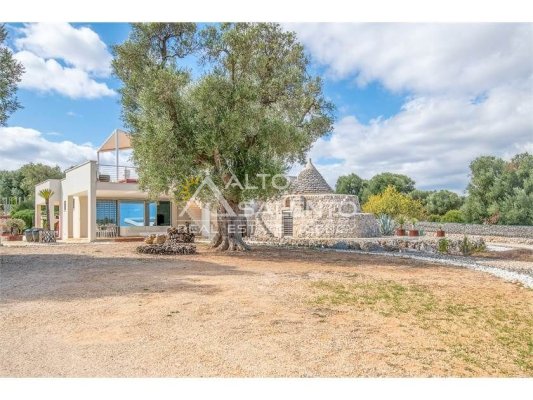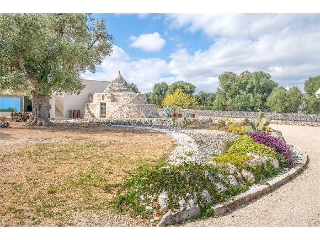 La proprietà, composta da una costruzione moderna comunicante con un vecchio trullo restaurato, ha una superficie di 160 mq ed è circondata da circa un ettaro di giardino privato, con splendidi olivi secolari e piante della macchia mediterranea.