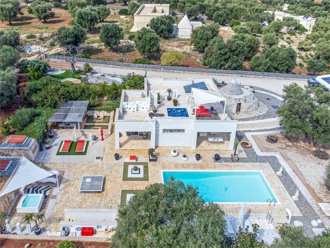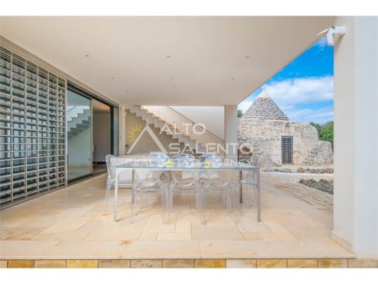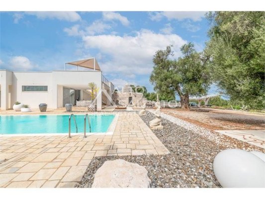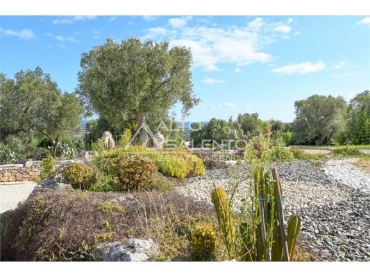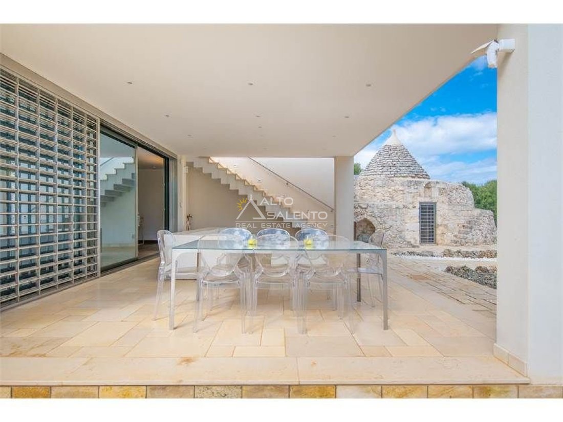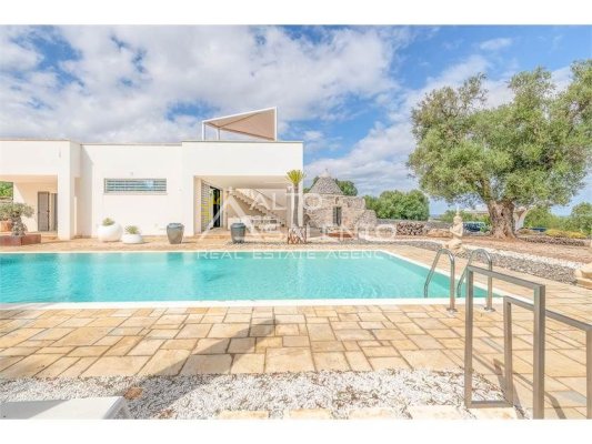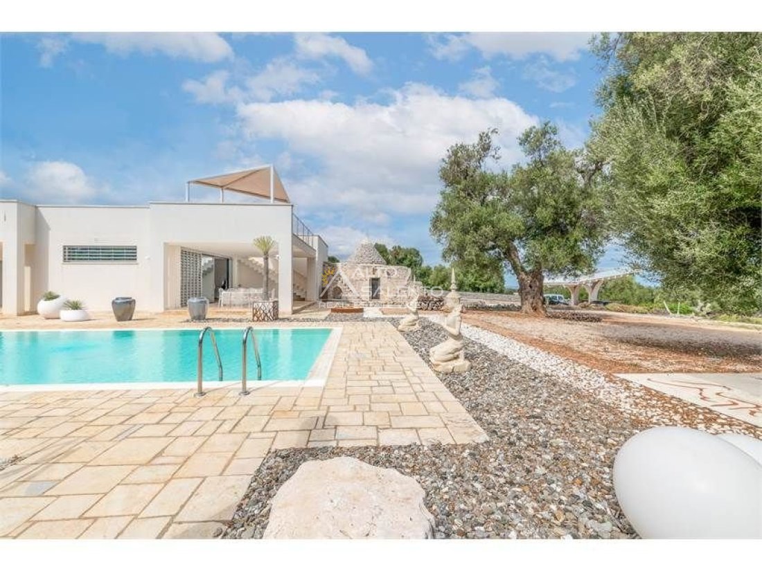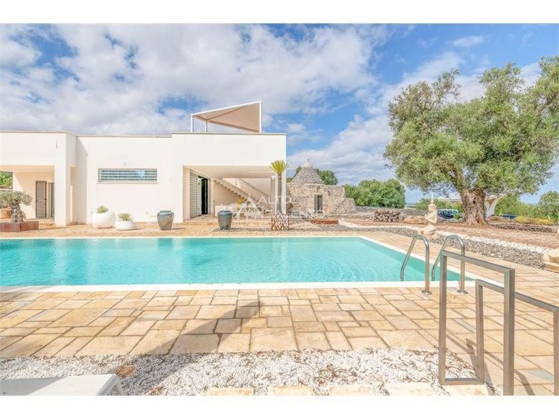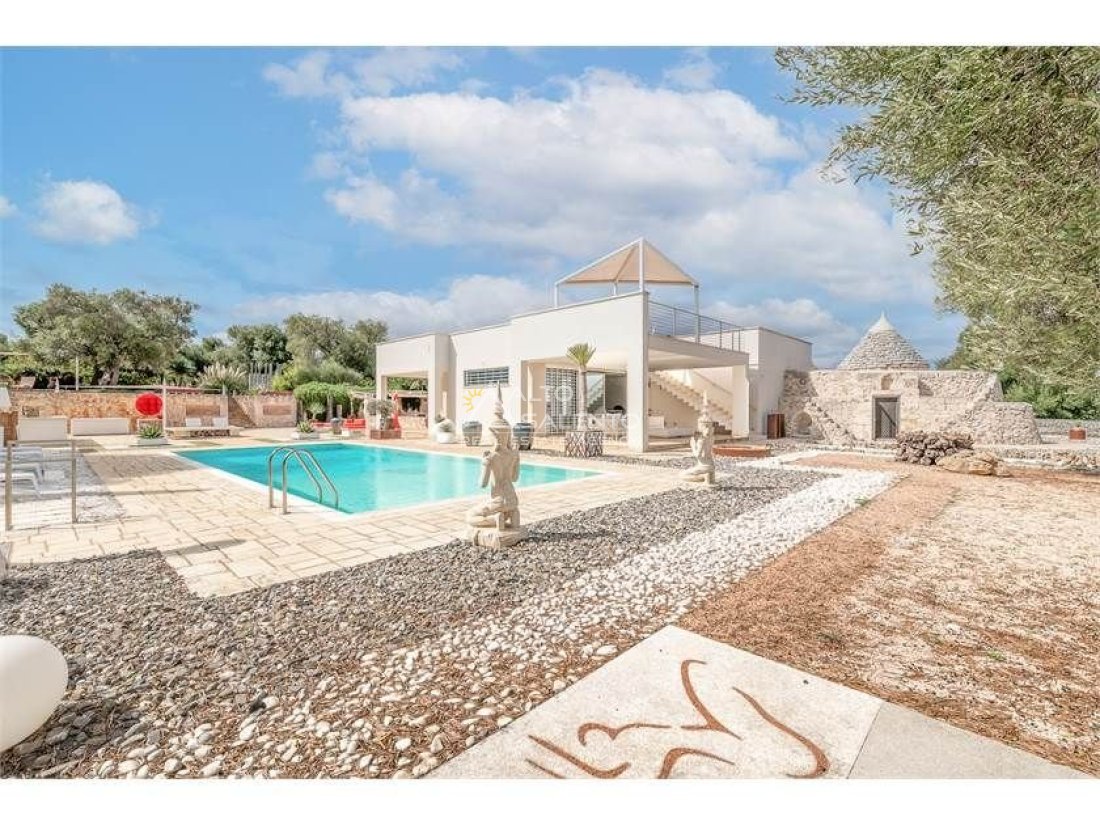 La proprietà, composta da una costruzione moderna comunicante con un vecchio trullo restaurato, ha una superficie di 160 mq ed è circondata da circa un ettaro di giardino privato, con splendidi olivi secolari e piante della macchia mediterranea.