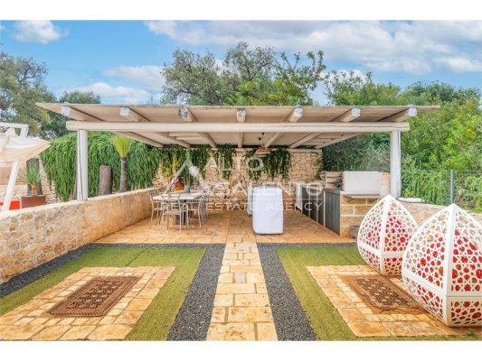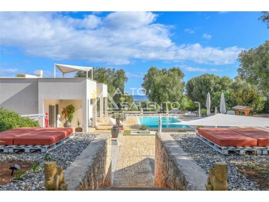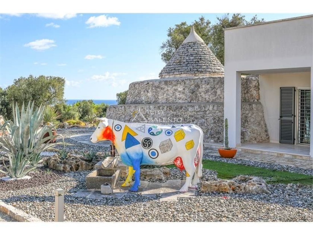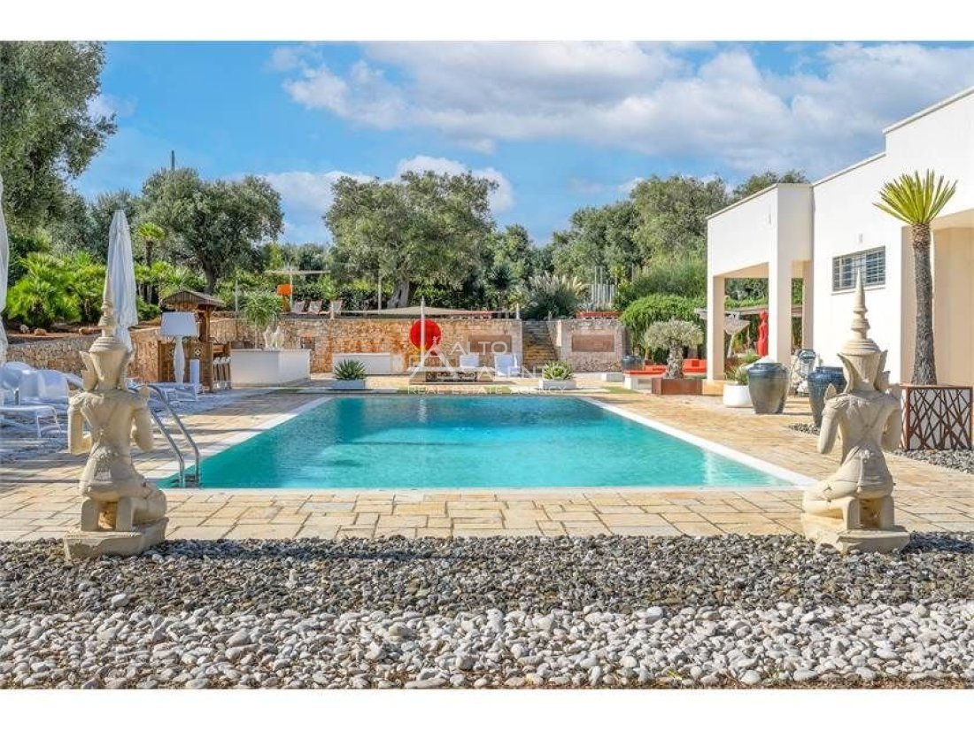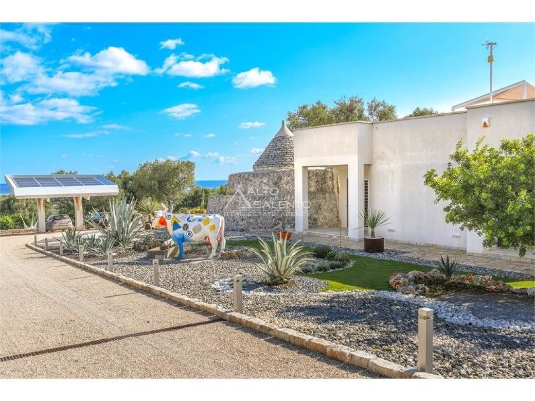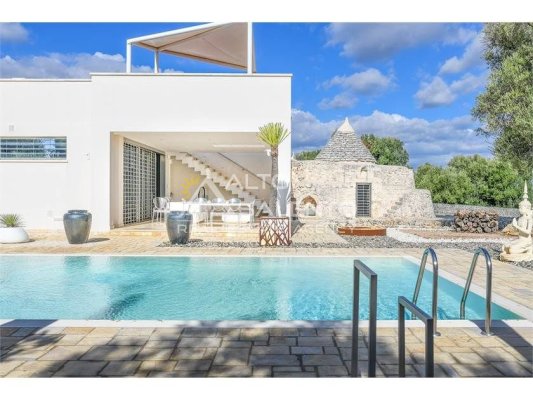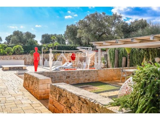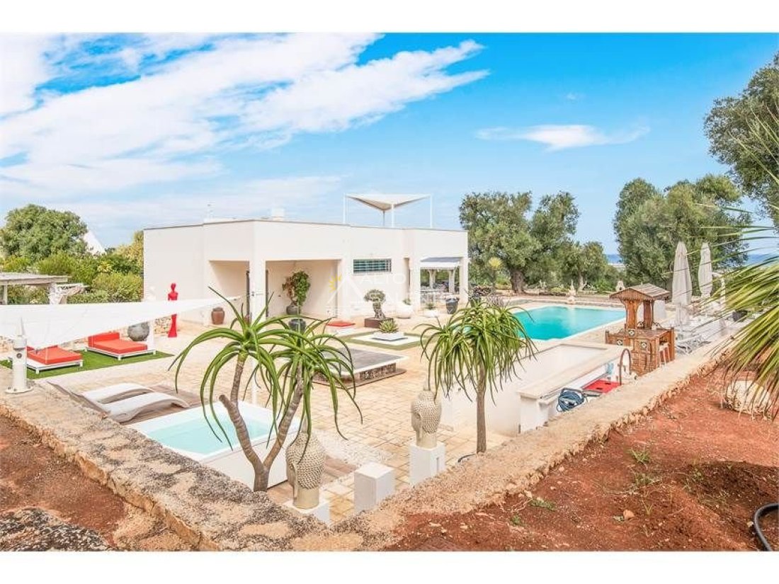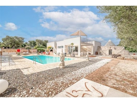 La proprietà, composta da una costruzione moderna comunicante con un vecchio trullo restaurato, ha una superficie di 160 mq ed è circondata da circa un ettaro di giardino privato, con splendidi olivi secolari e piante della macchia mediterranea.