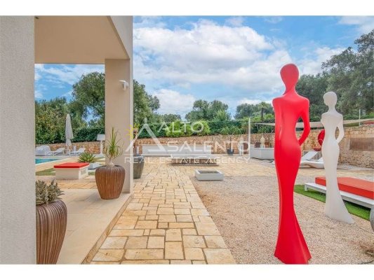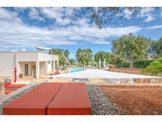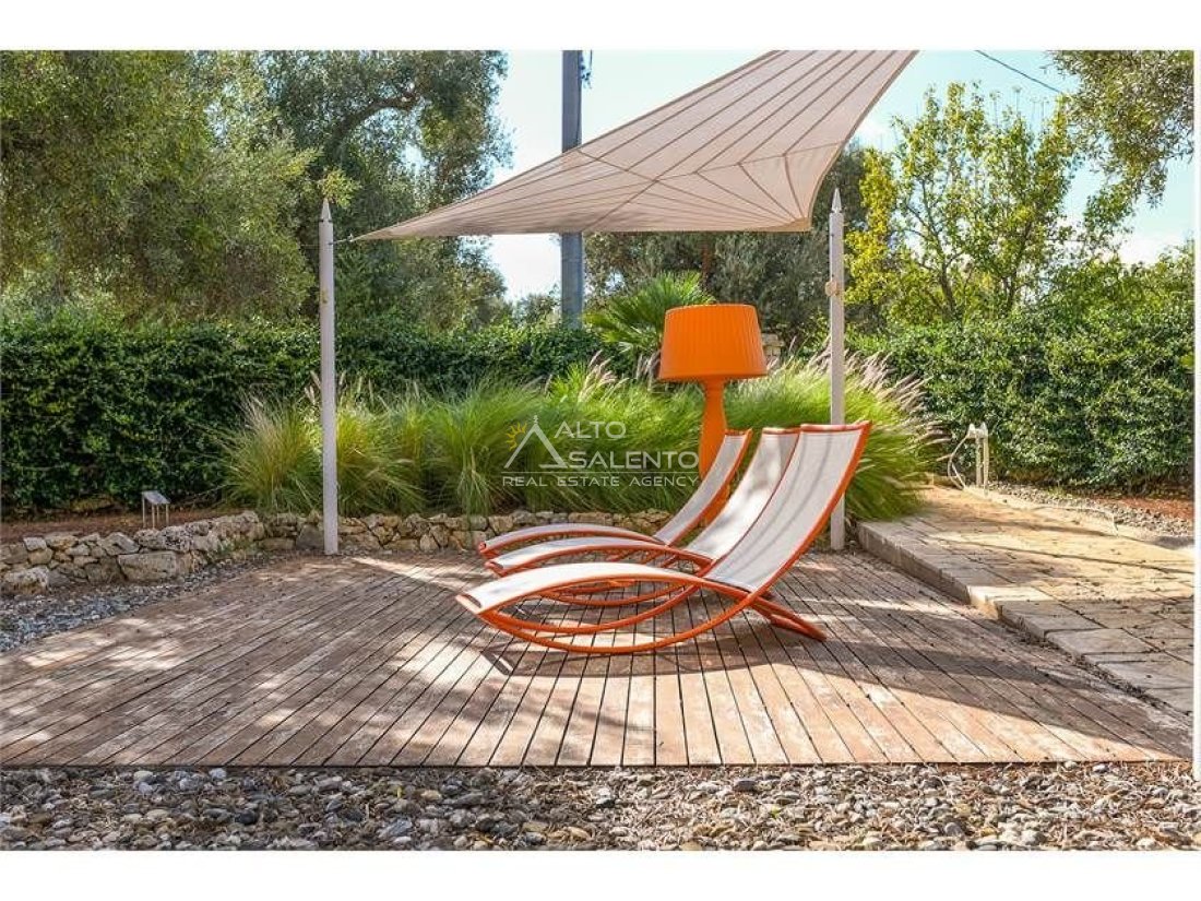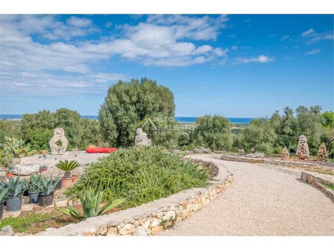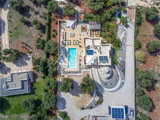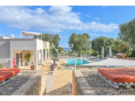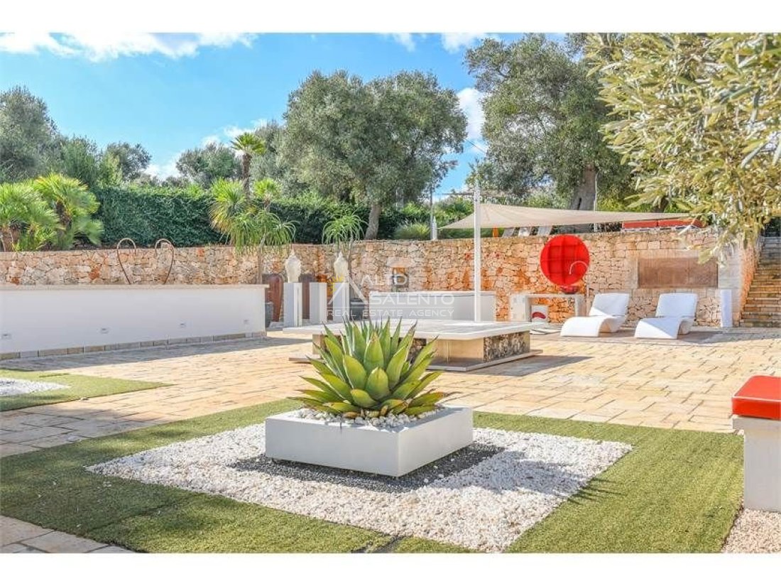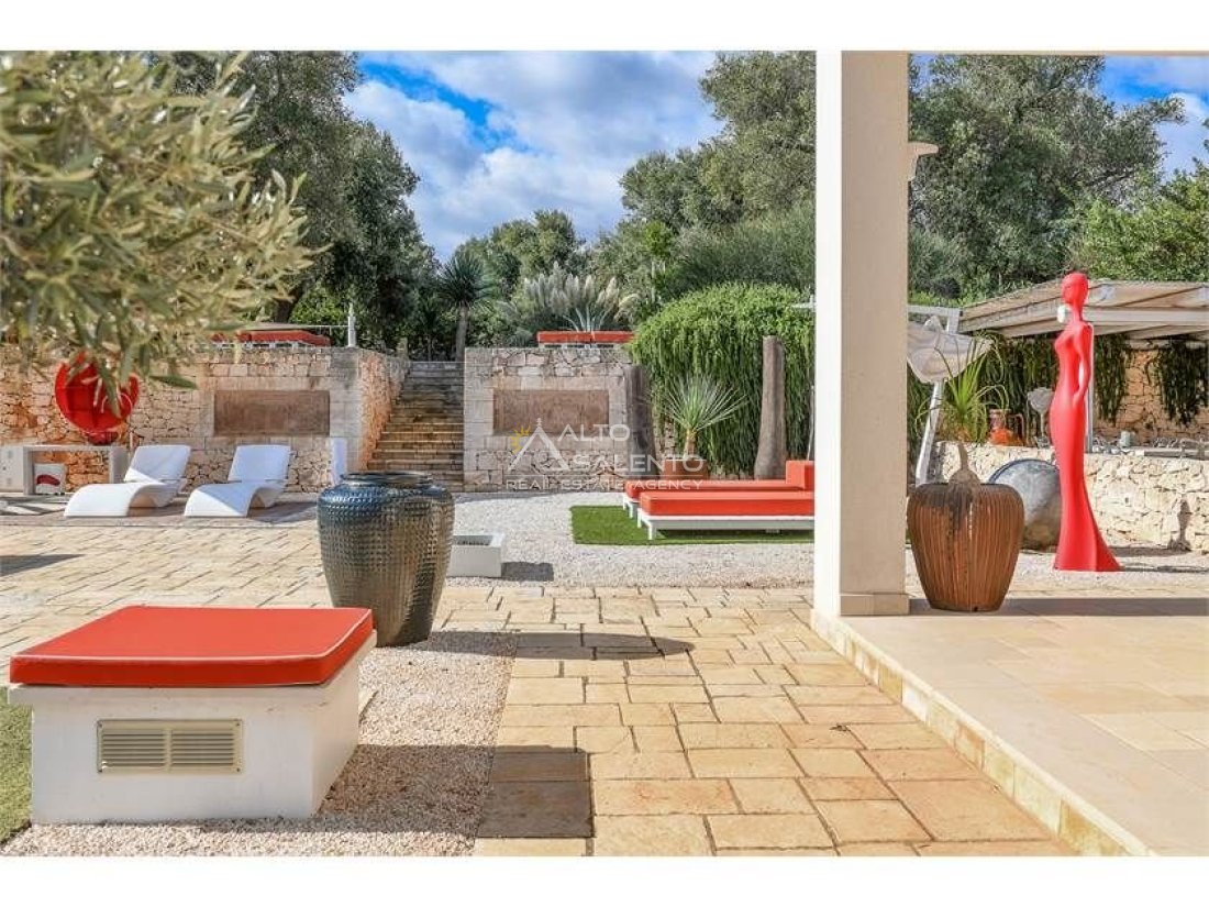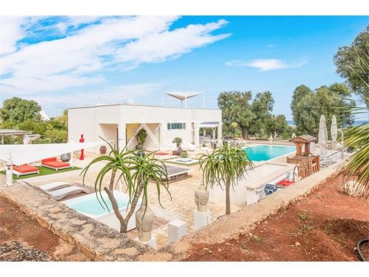 La proprietà, composta da una costruzione moderna comunicante con un vecchio trullo restaurato, ha una superficie di 160 mq ed è circondata da circa un ettaro di giardino privato, con splendidi olivi secolari e piante della macchia mediterranea.