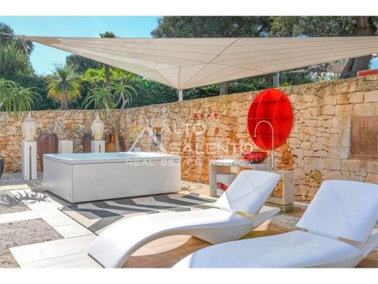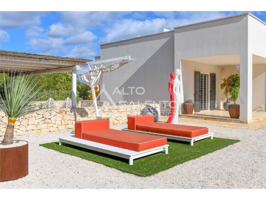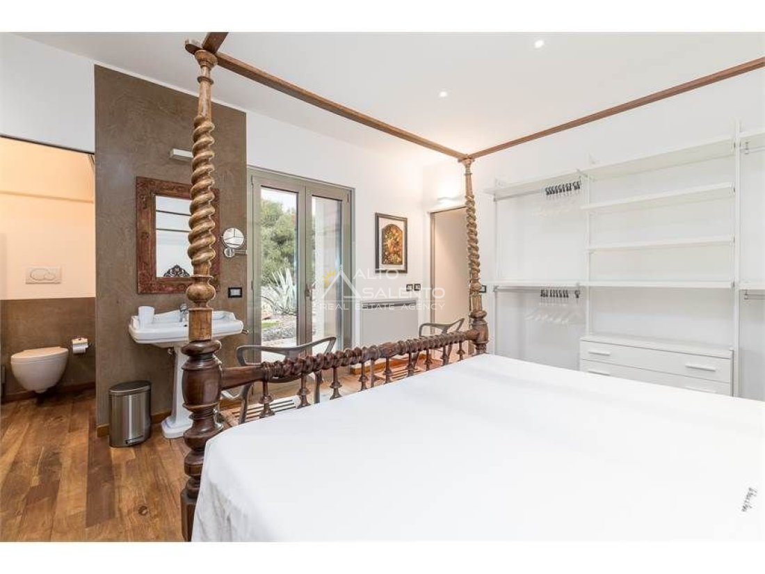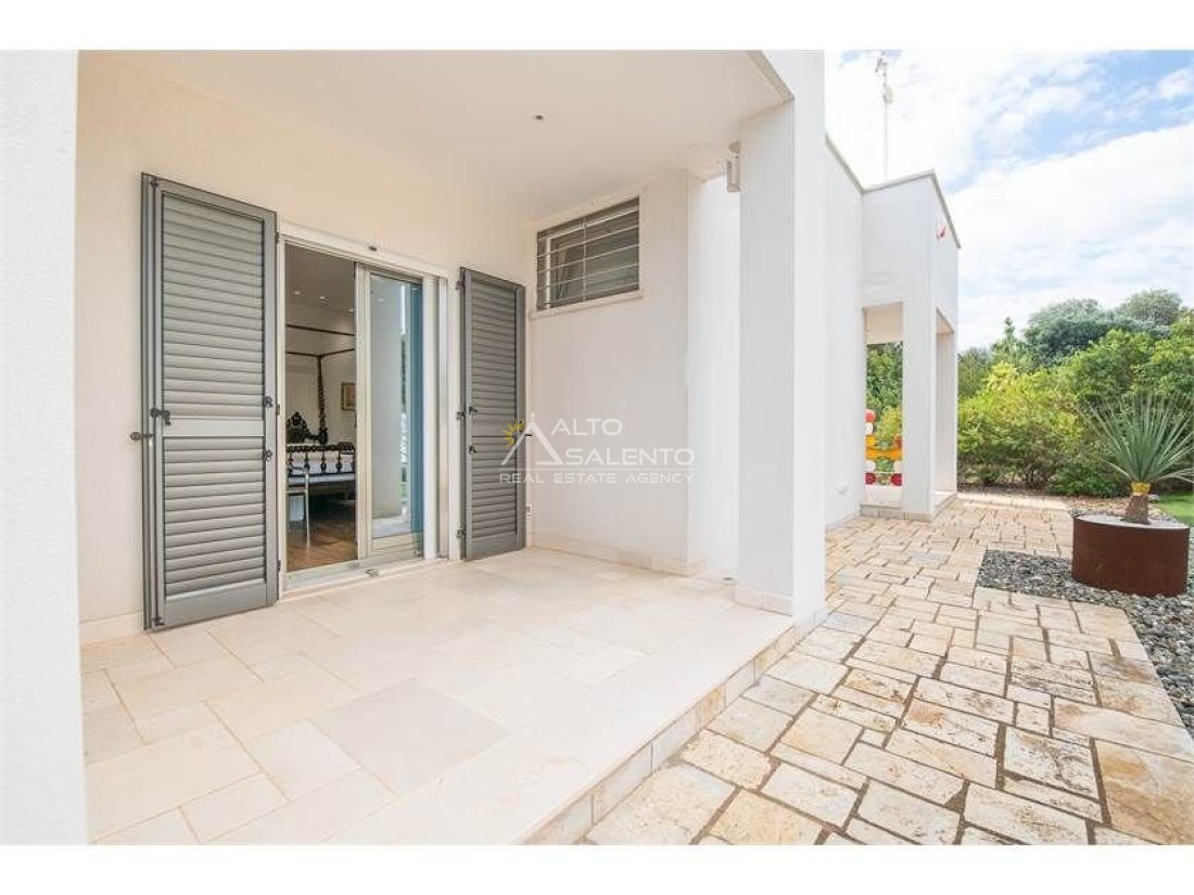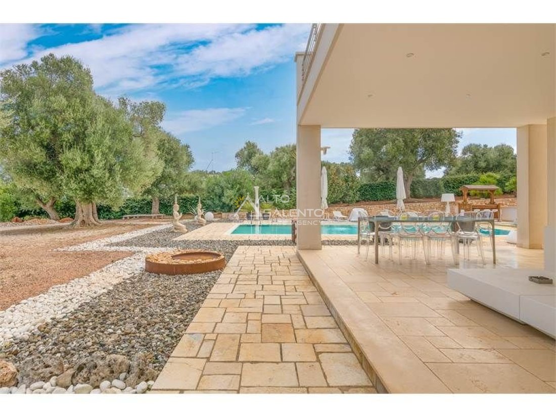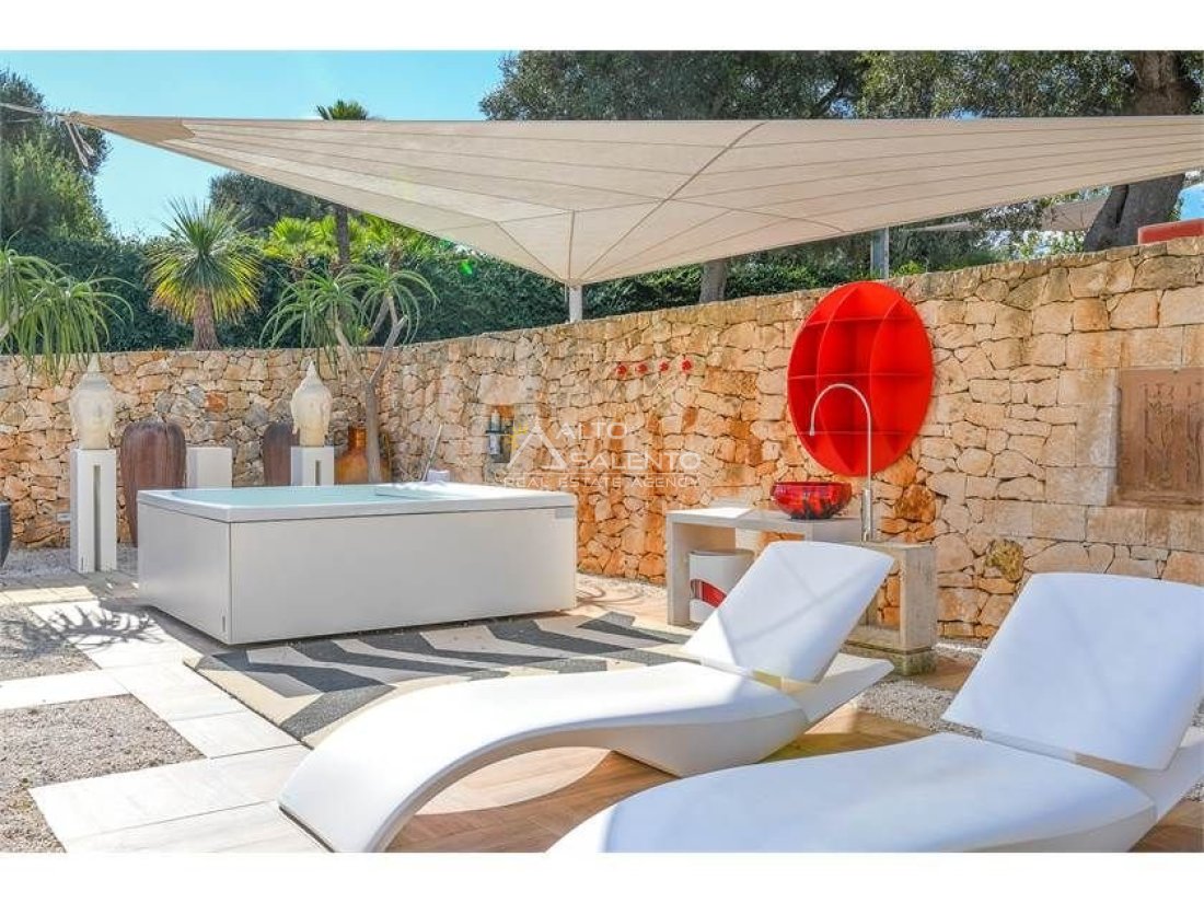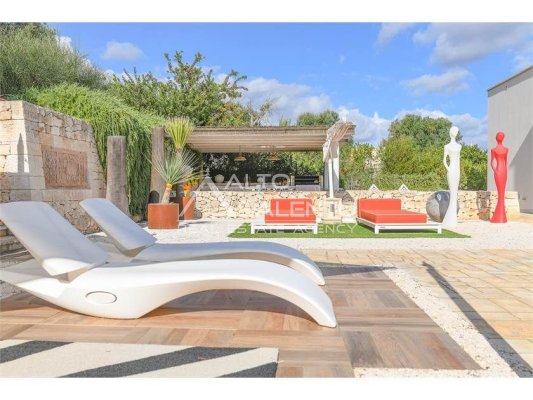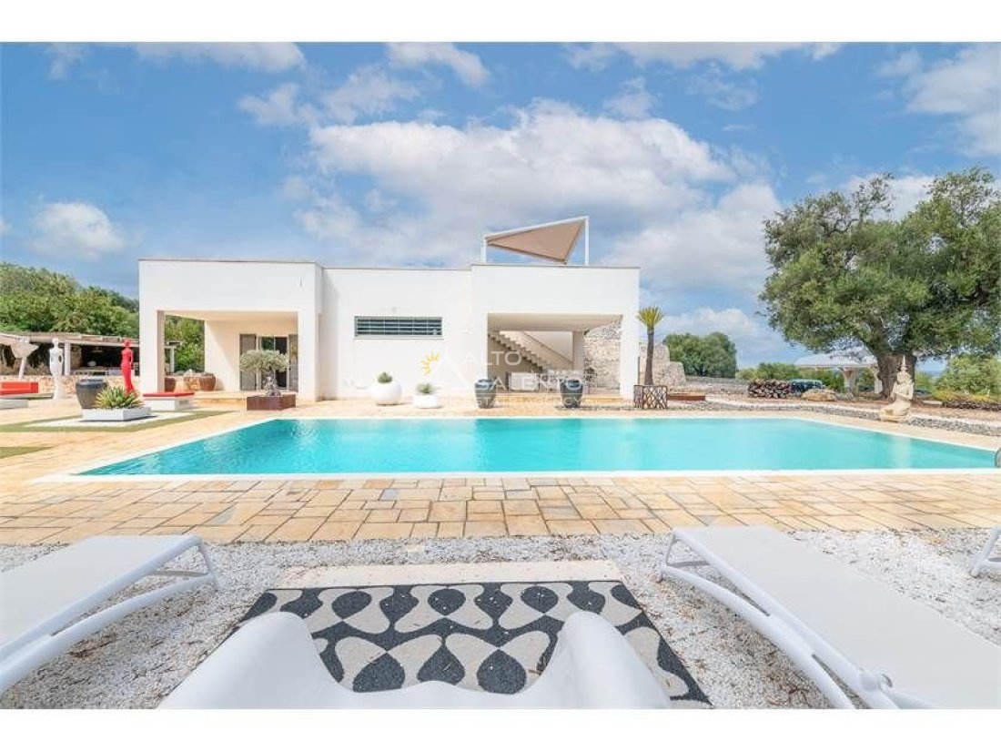 La proprietà, composta da una costruzione moderna comunicante con un vecchio trullo restaurato, ha una superficie di 160 mq ed è circondata da circa un ettaro di giardino privato, con splendidi olivi secolari e piante della macchia mediterranea.