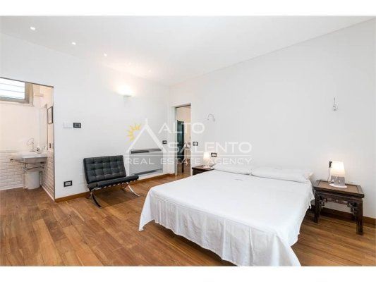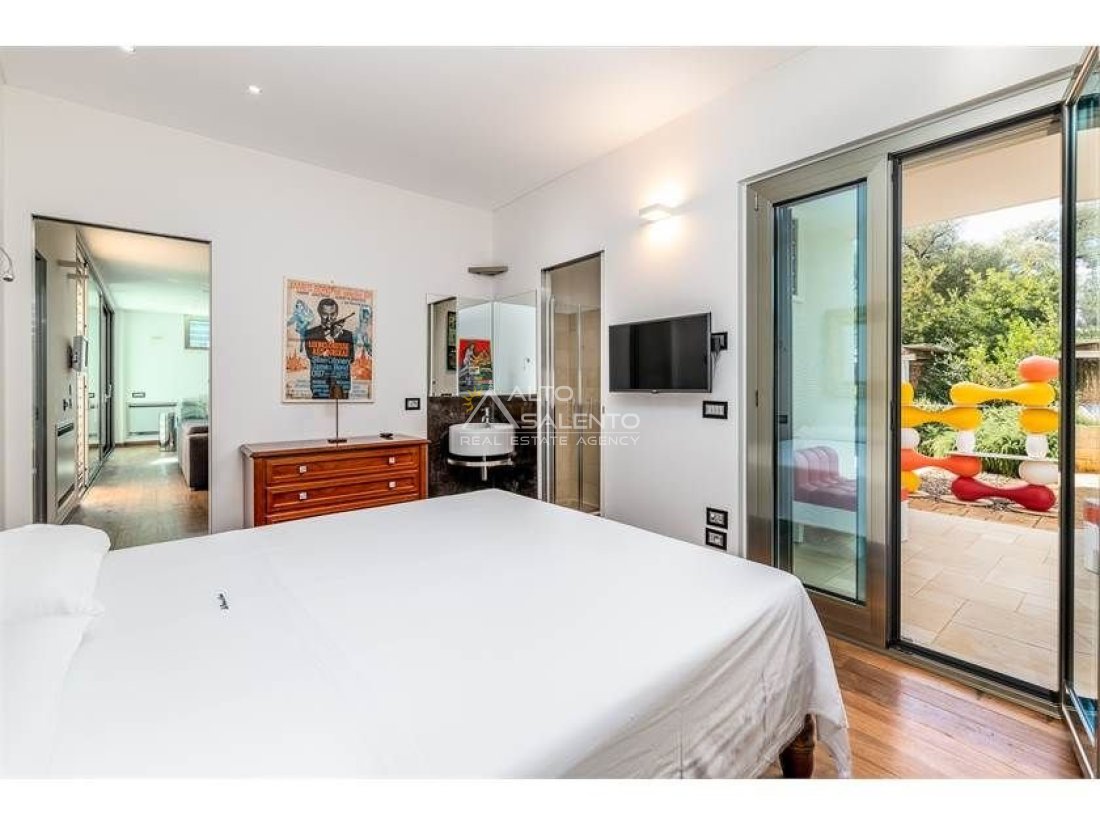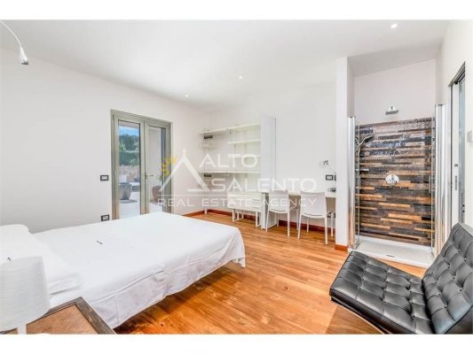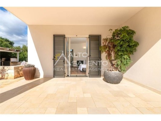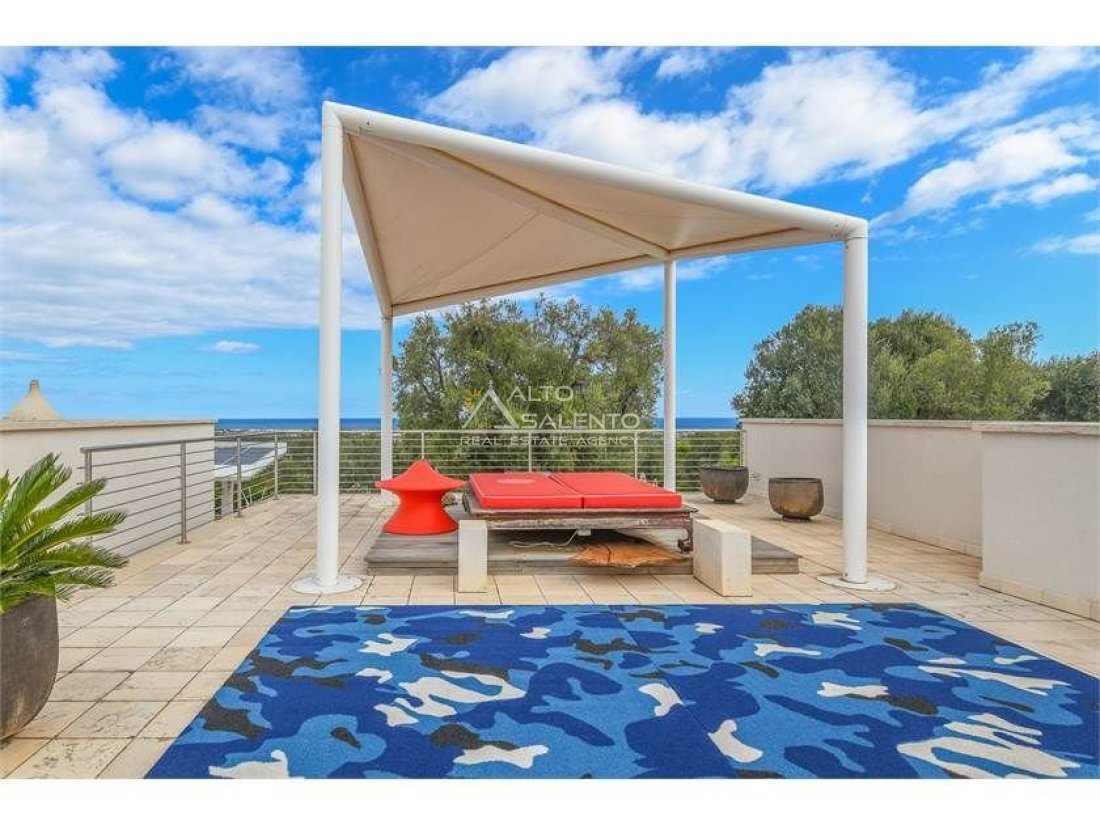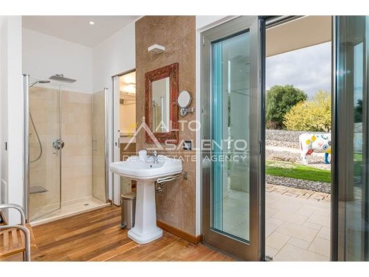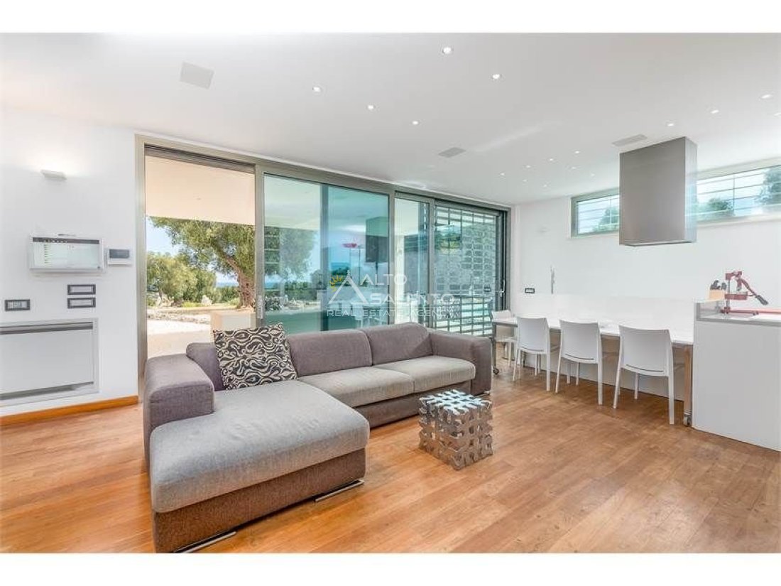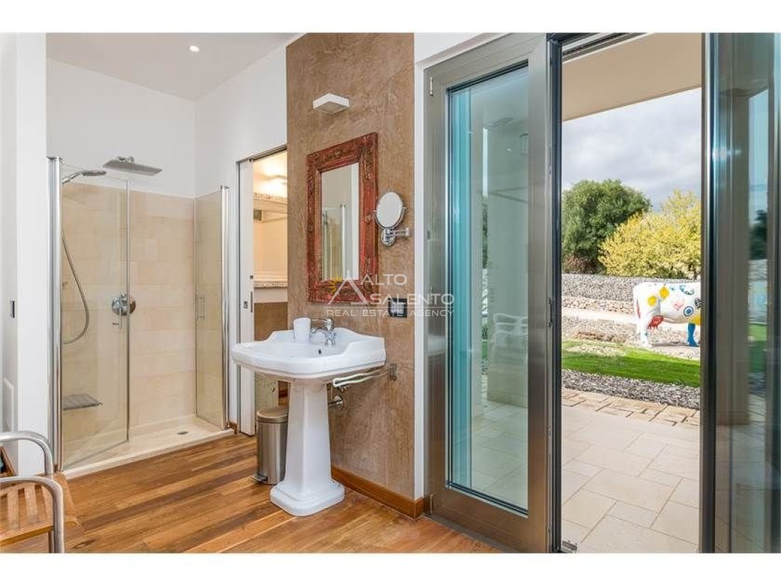 Dall'ampia veranda panoramica si accede al luminoso e grande open space con cucina a vista. Dal soggiorno si raggiungono, tramite tre porte, alle tre camere da letto ciascuna con il proprio bagno con doccia, porta finestra e verandina privata. Una delle camere da letto è collegata con il trullo che ospita inoltre un soggiorno.