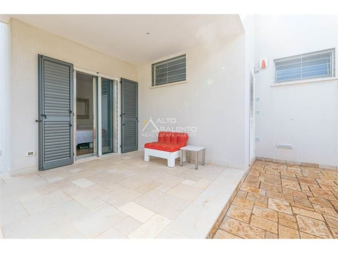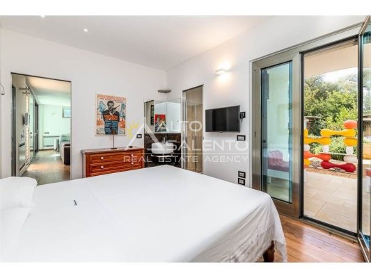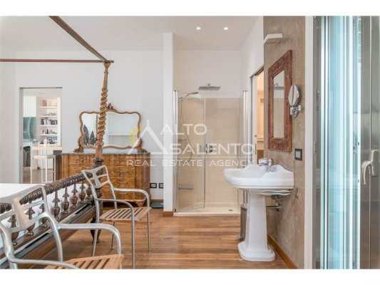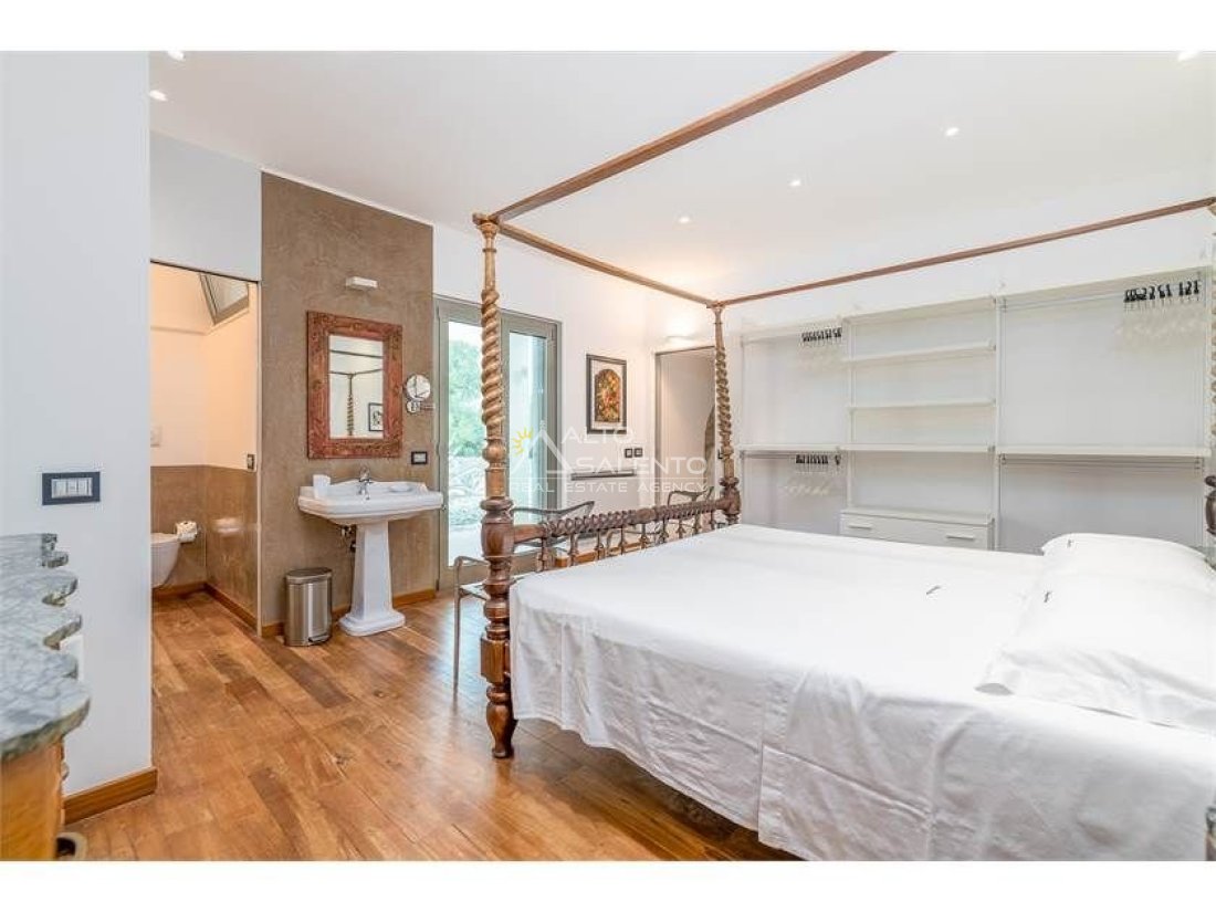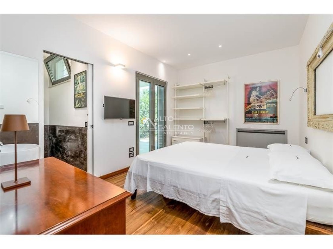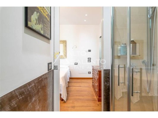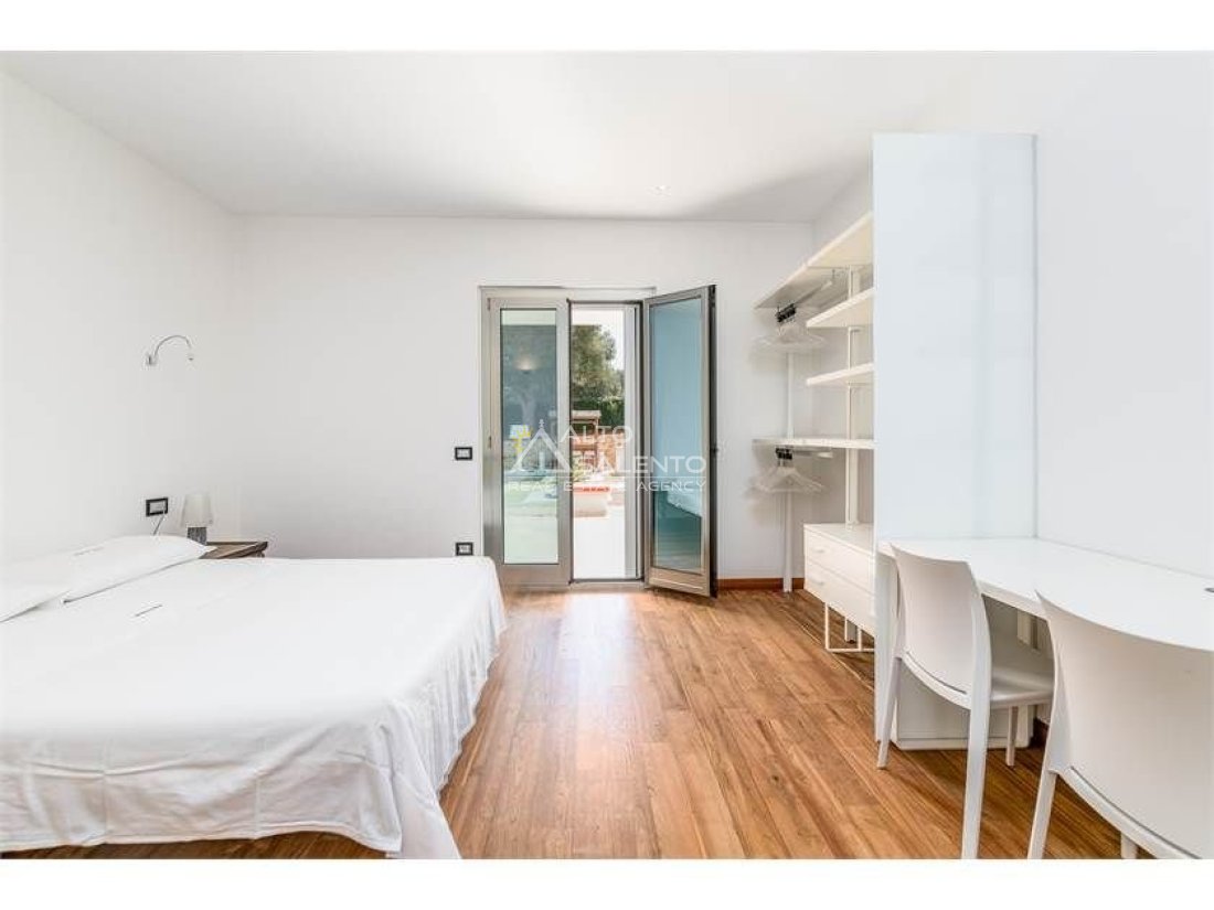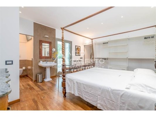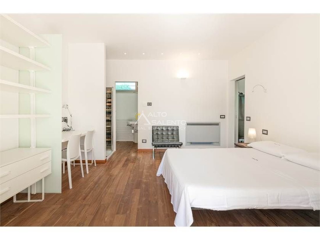 Dall'ampia veranda panoramica si accede al luminoso e grande open space con cucina a vista. Dal soggiorno si raggiungono, tramite tre porte, alle tre camere da letto ciascuna con il proprio bagno con doccia, porta finestra e verandina privata. Una delle camere da letto è collegata con il trullo che ospita inoltre un soggiorno.