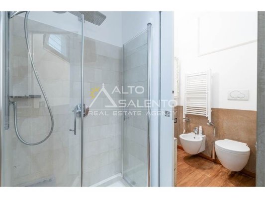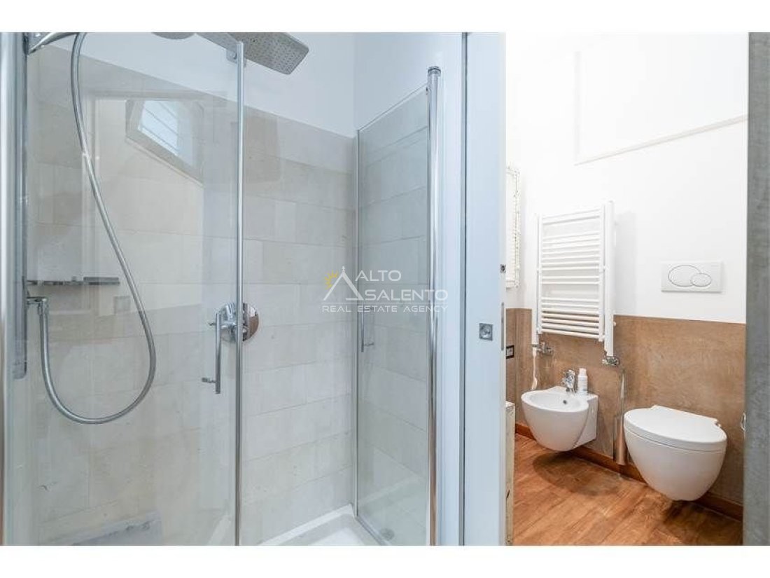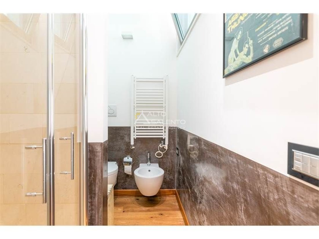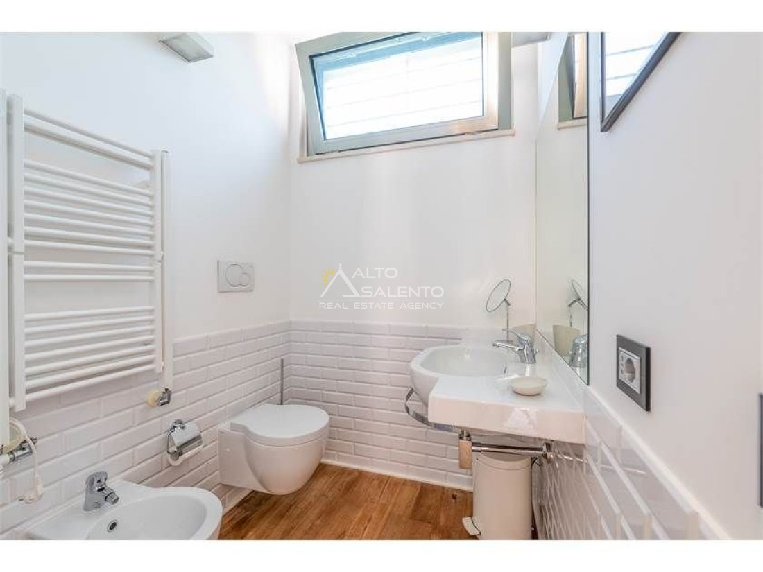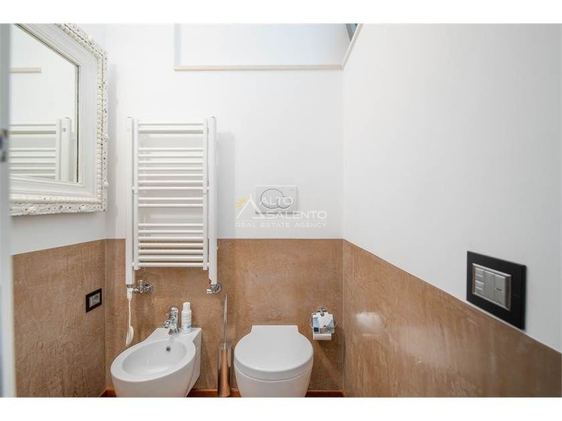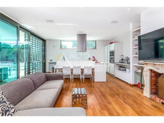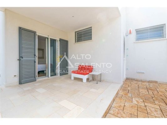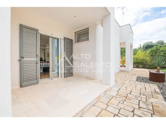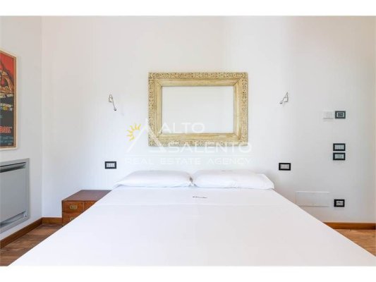 Dall'ampia veranda panoramica si accede al luminoso e grande open space con cucina a vista. Dal soggiorno si raggiungono, tramite tre porte, alle tre camere da letto ciascuna con il proprio bagno con doccia, porta finestra e verandina privata. Una delle camere da letto è collegata con il trullo che ospita inoltre un soggiorno.
