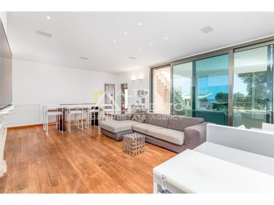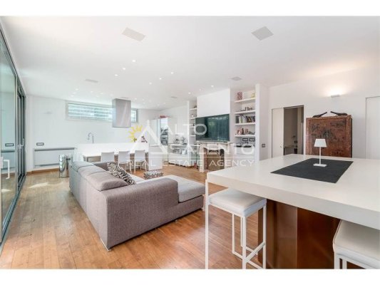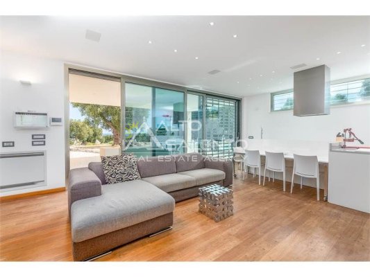Dall’ampia veranda panoramica grandi porte/ finestre consentono di accedere allo spazioso soggiorno a pianta aperta, con una comoda cucina a vista.