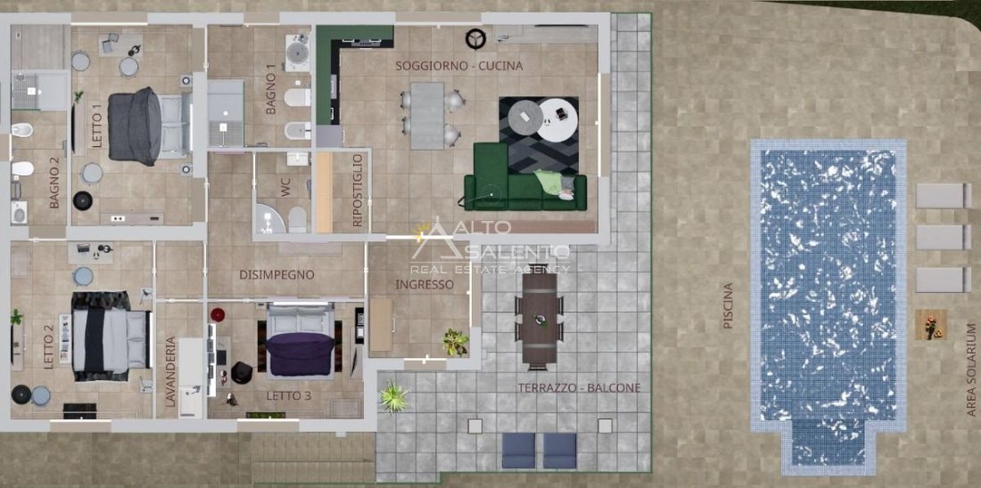 Veranda coperta (40 mq): Spazio living esterno perfettamente integrato con la zona giorno, ideale per cene all'aperto con vista sul tramonto.