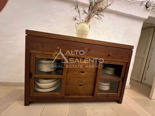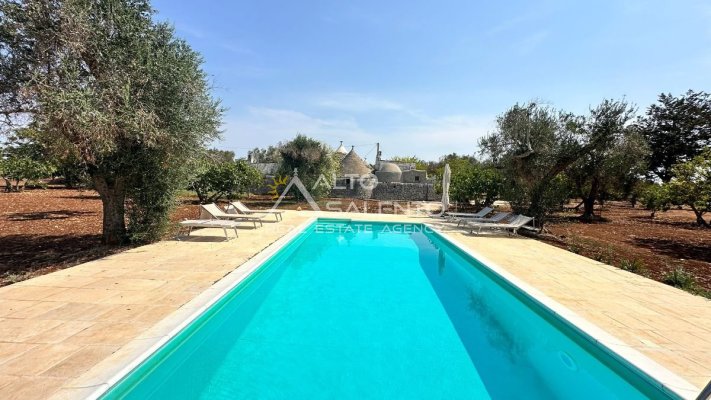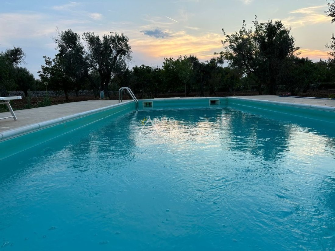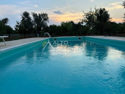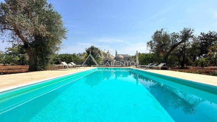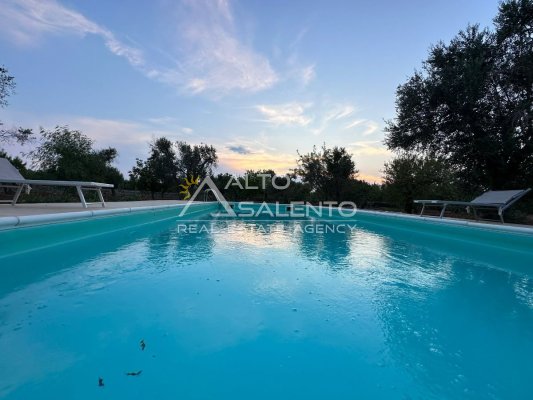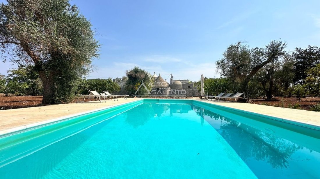 All’esterno, la proprietà regala scorci di rara bellezza: ampie aree pavimentate in chianche originali, zone relax e una splendida piscina privata, perfettamente integrata nel paesaggio. Lo spazio circostante offre aree ombreggiate, angoli di quiete e la possibilità di allestire una cucina all’aperto o un salotto estivo sotto la pergola.