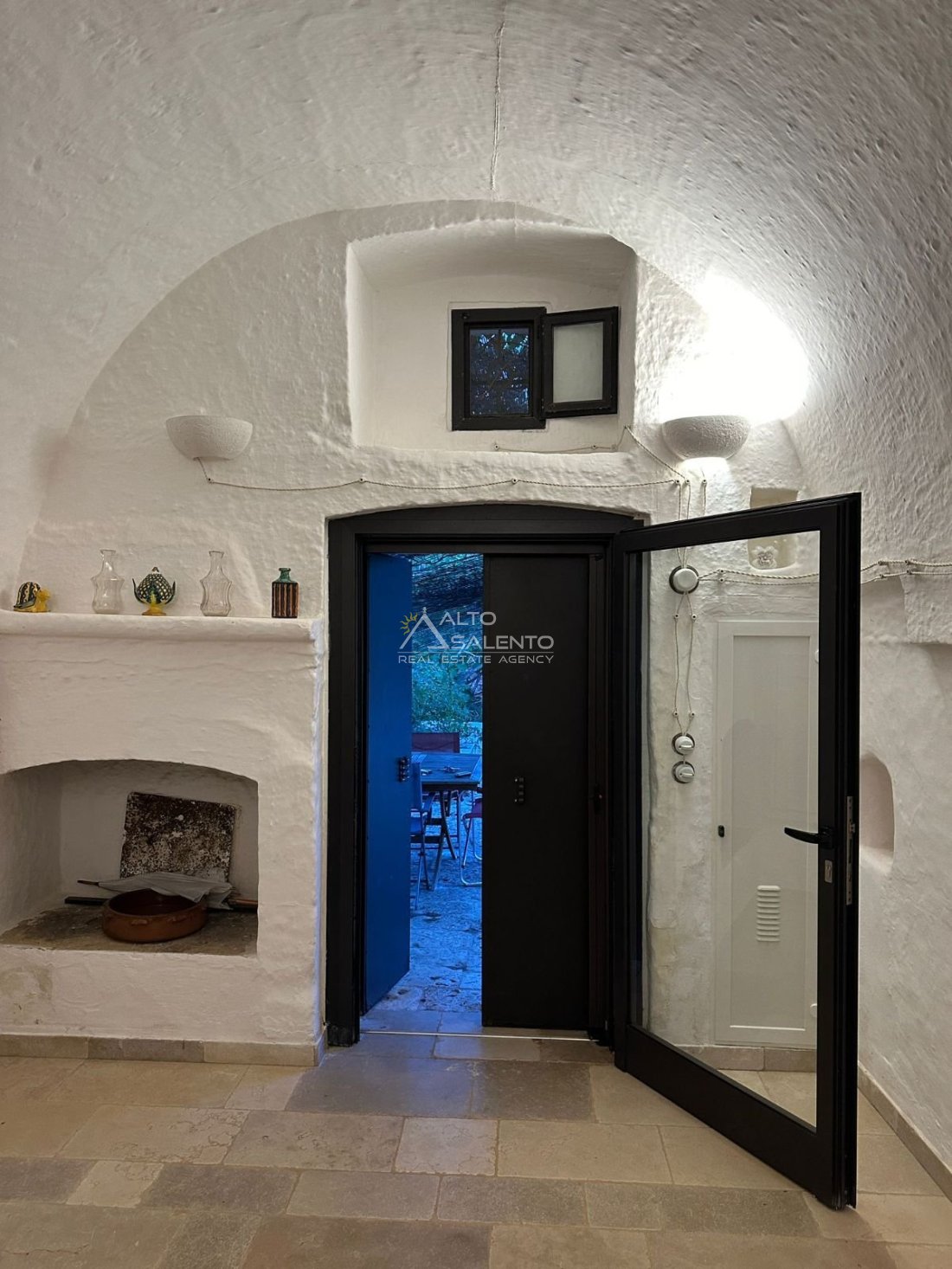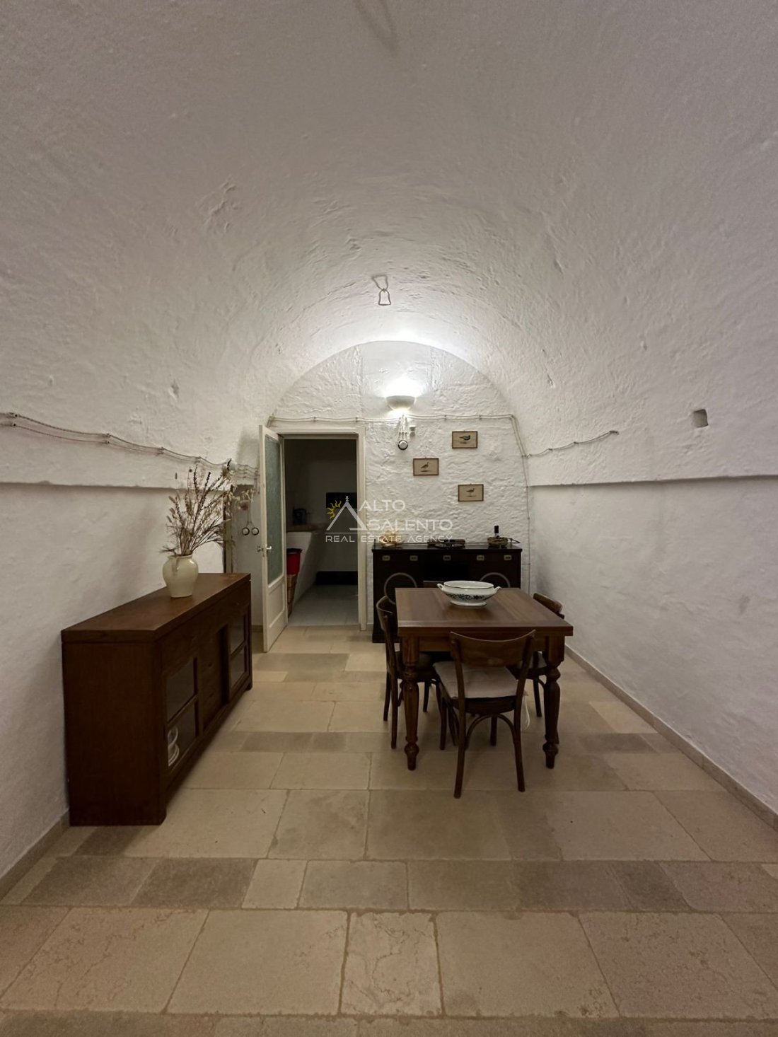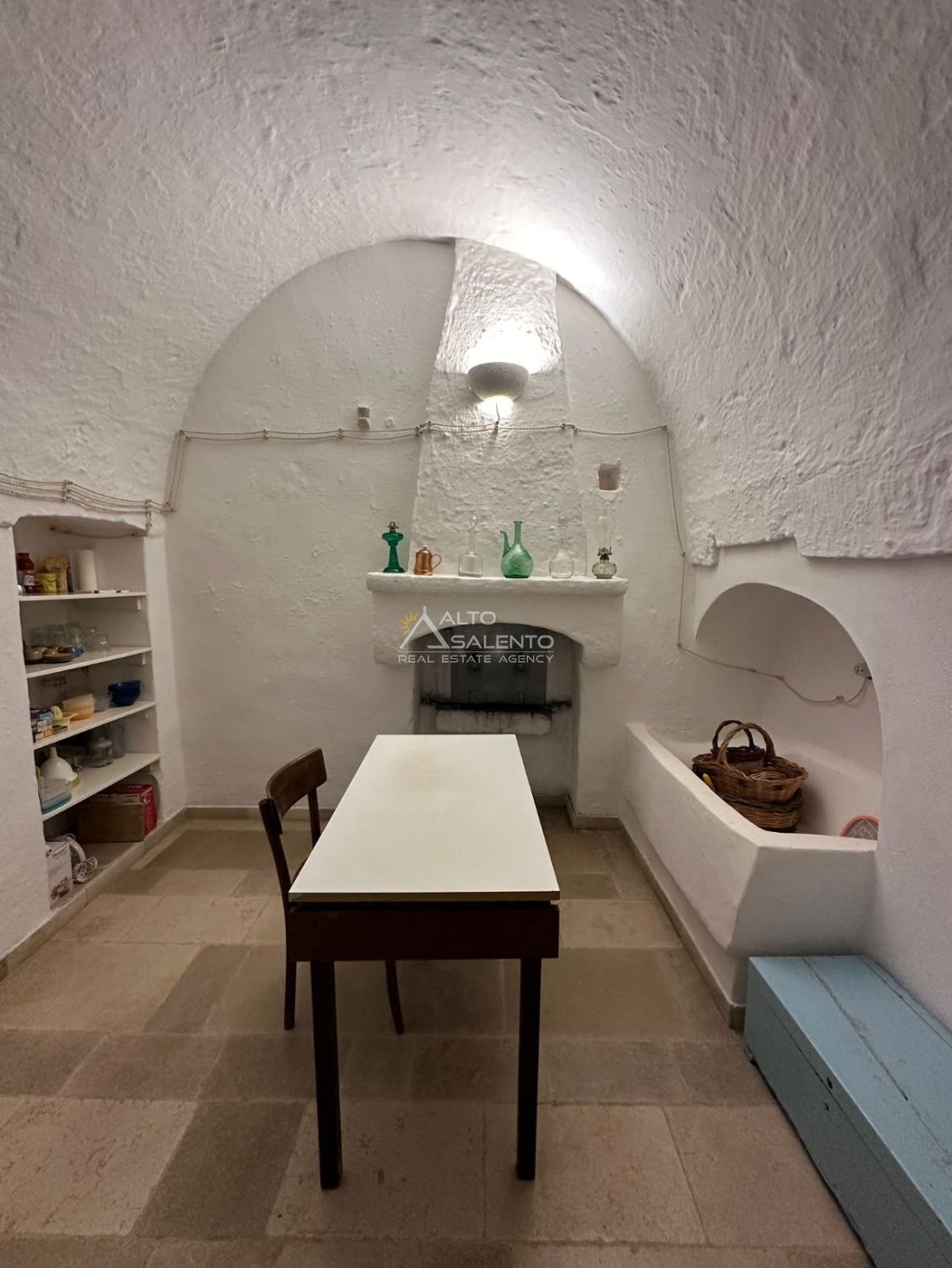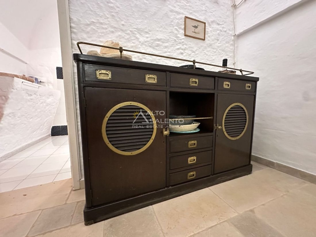 Gli interni, curati nei materiali e nelle proporzioni, mantengono il fascino originario dei trulli grazie alle pietre a vista, alle chianche autentiche e alla luce naturale che valorizza ogni ambiente, creando un’atmosfera calda e accogliente.