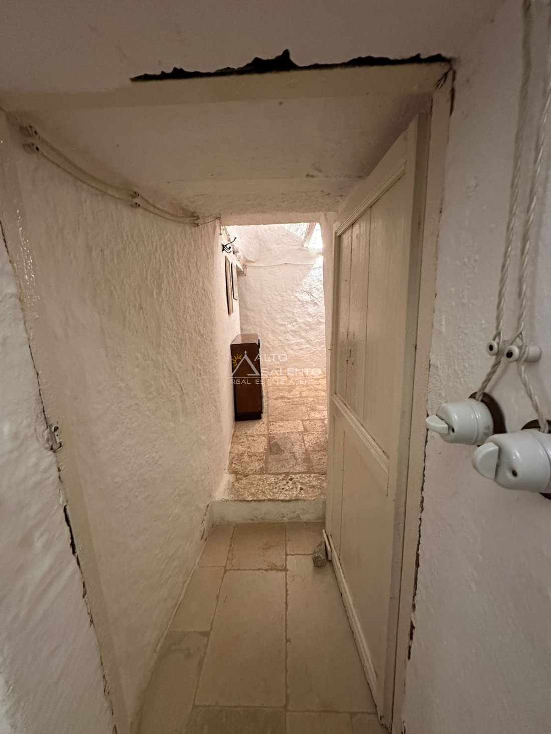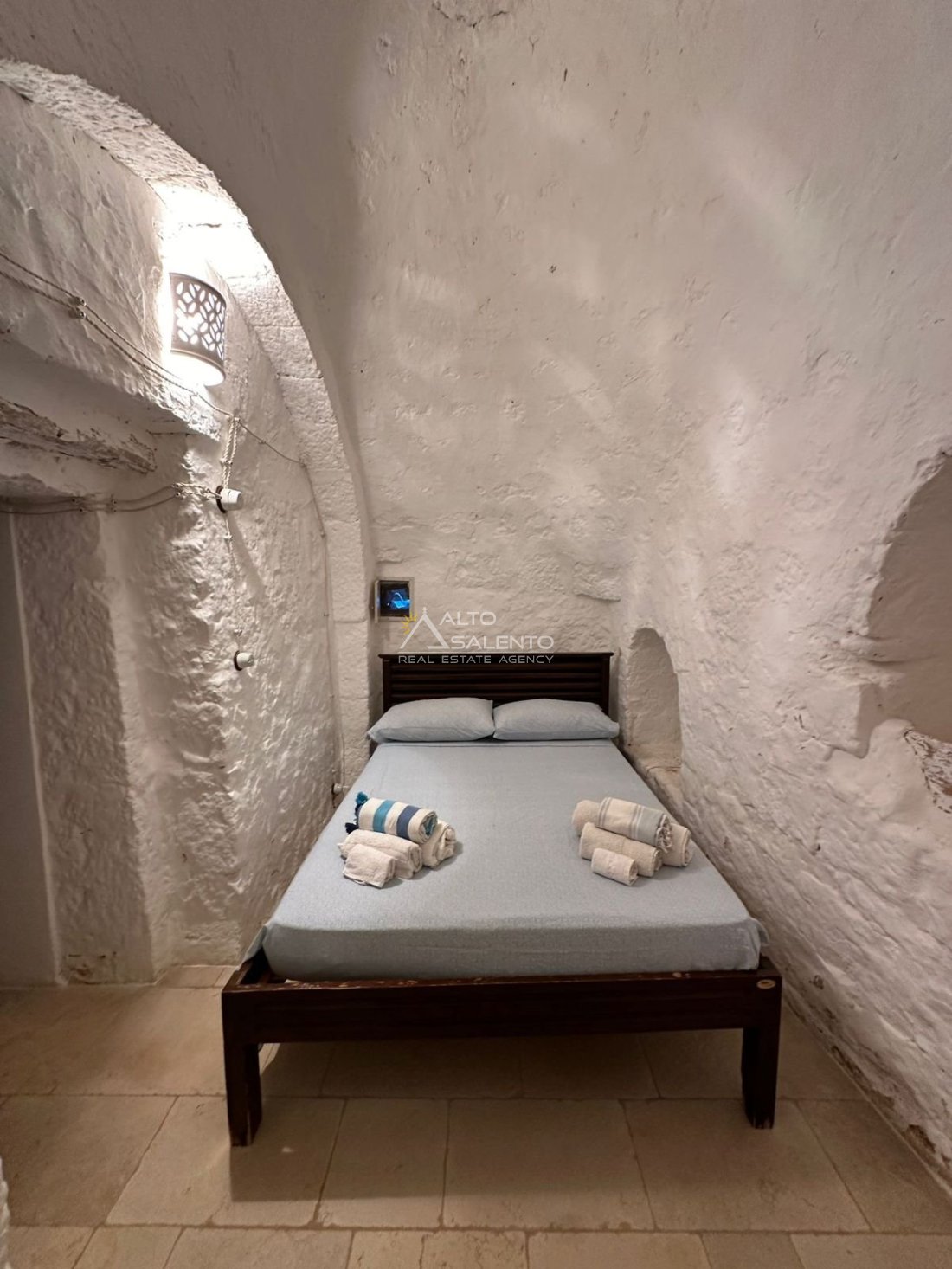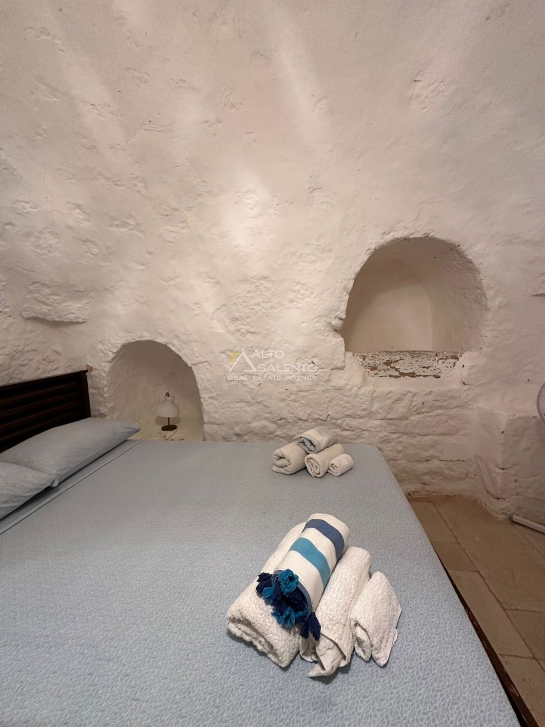 Gli interni, curati nei materiali e nelle proporzioni, mantengono il fascino originario dei trulli grazie alle pietre a vista, alle chianche autentiche e alla luce naturale che valorizza ogni ambiente, creando un’atmosfera calda e accogliente.