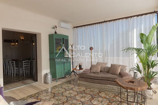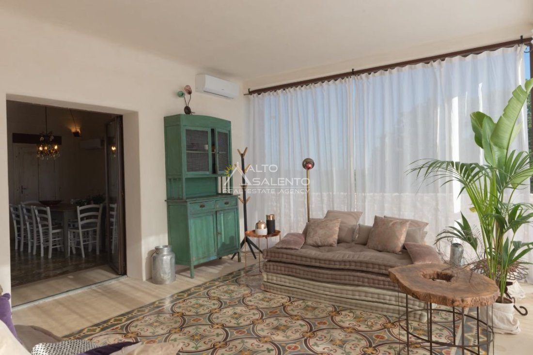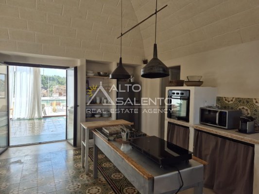 Zona living open space: cucina e sala da pranzo caratterizzate da volte a cielo di carrozza, cementine antiche e spazi luminosi dal forte impatto estetico.