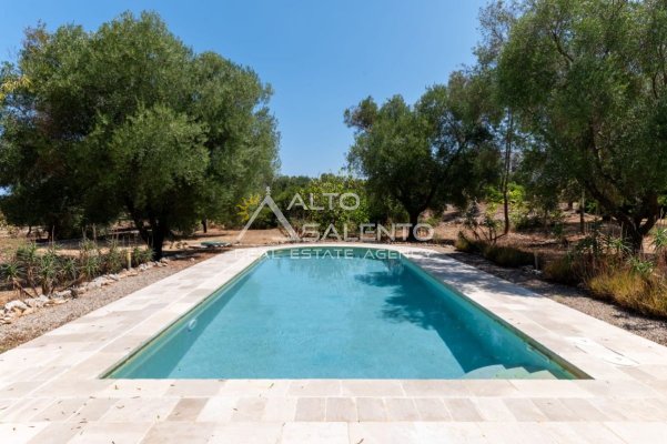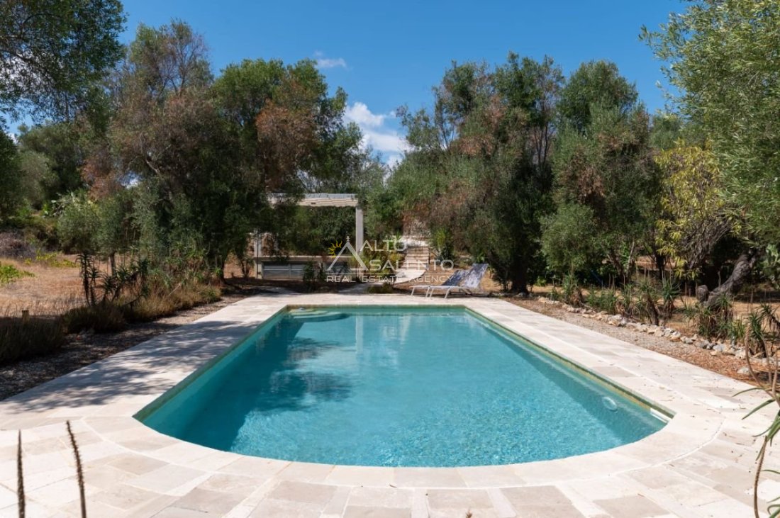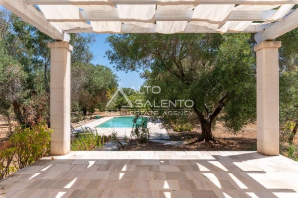 All’esterno, un’oasi di relax con piscina privata di 40 mq, solarium in pietra naturale e gazebo ombreggiante, perfetto per godere della tranquillità della campagna pugliese.