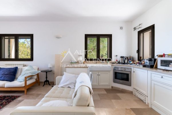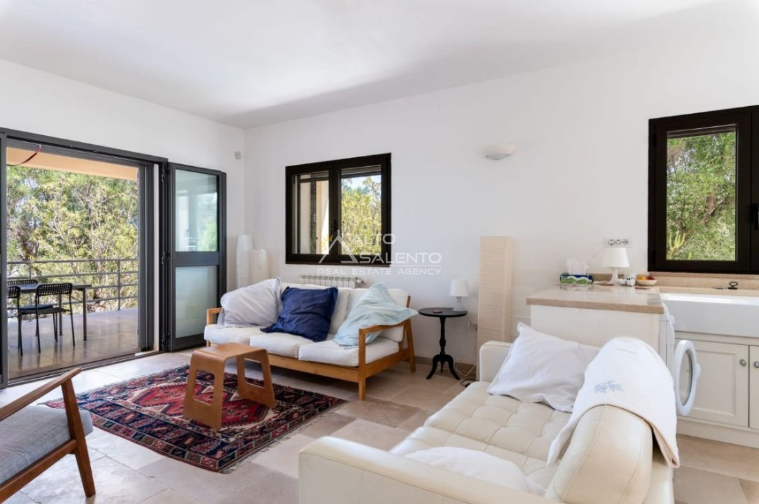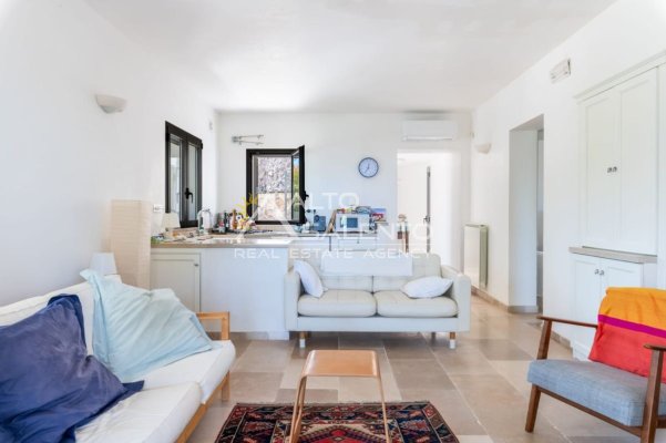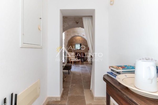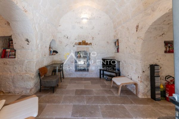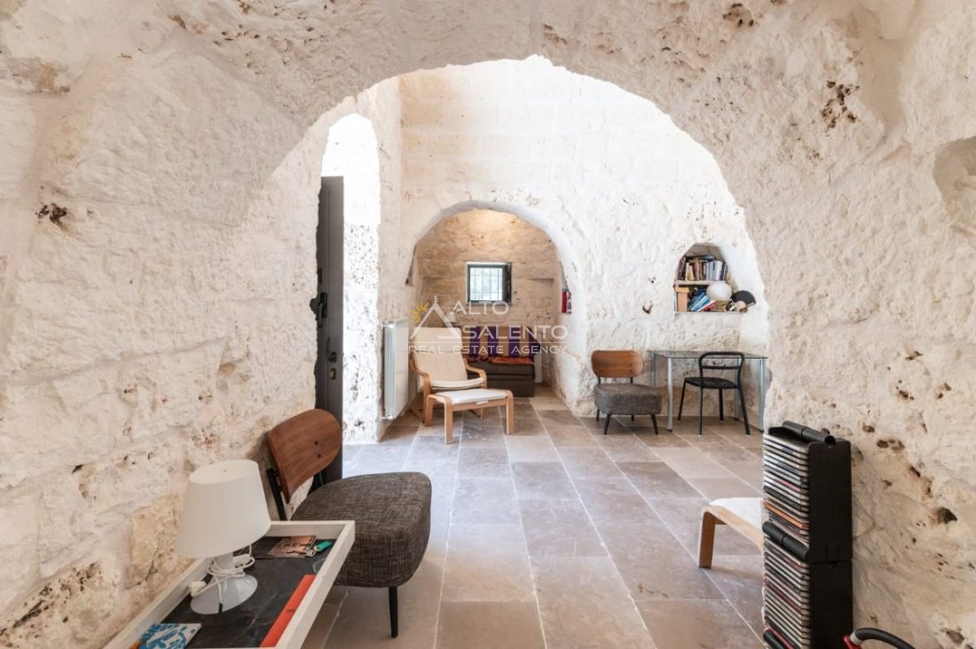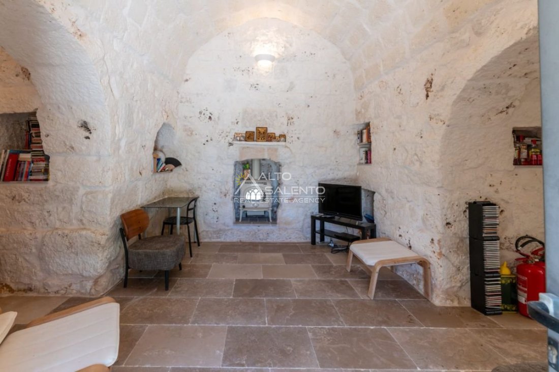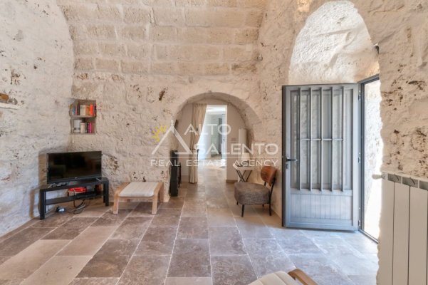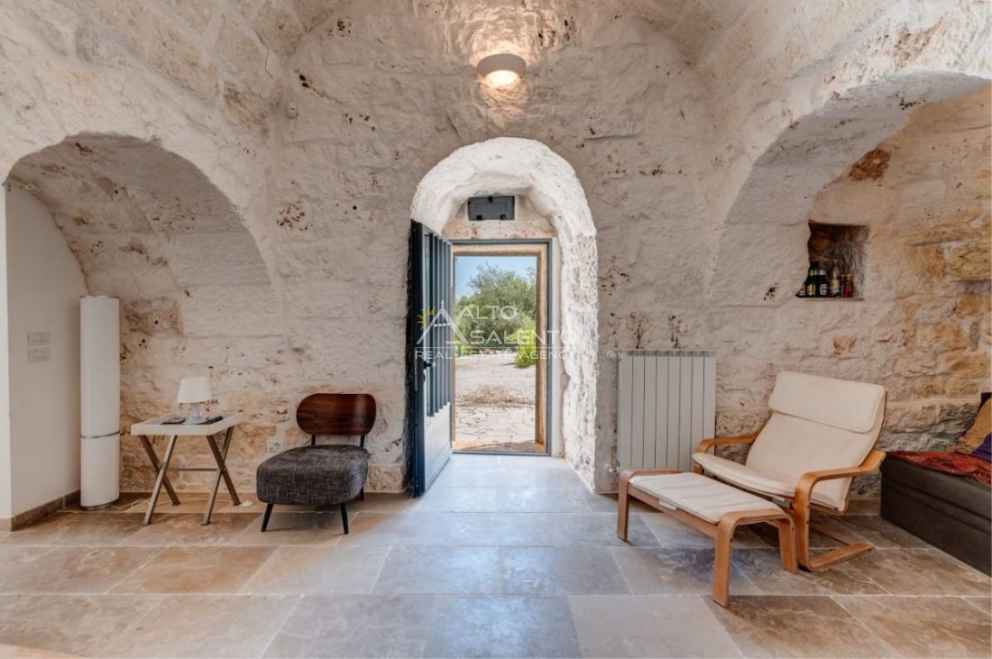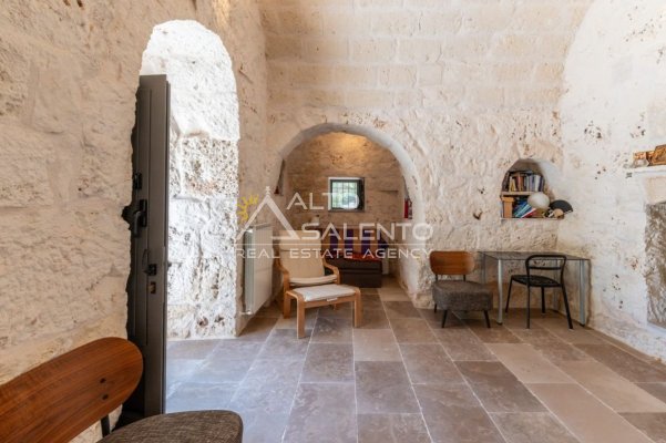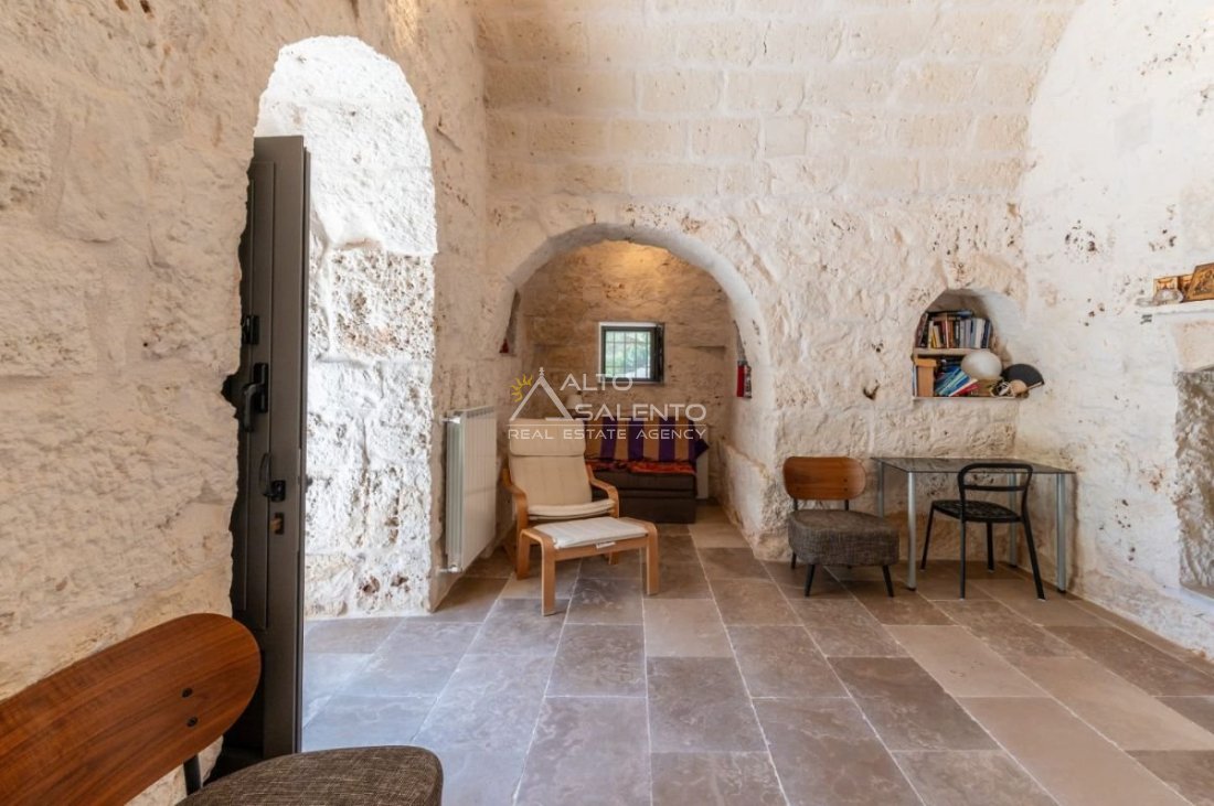 Gli ambienti sono caratterizzati da pavimenti in pietra locale e grandi aperture che garantiscono luce naturale in ogni stanza. Il trullo, restaurato nel rispetto delle tecniche costruttive tradizionali, presenta affascinanti muri in pietra a vista.