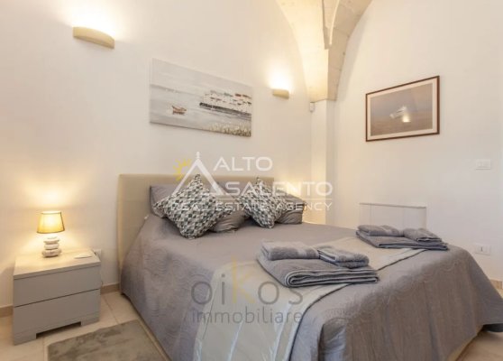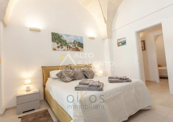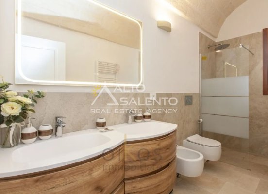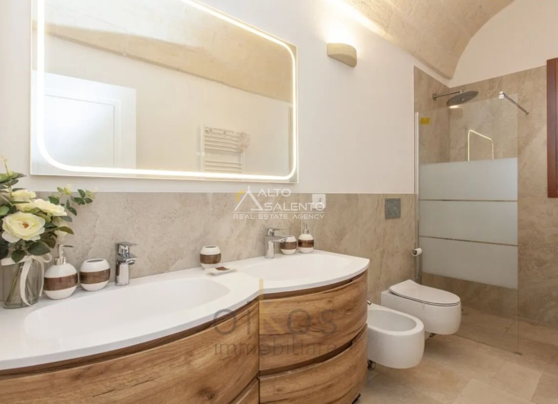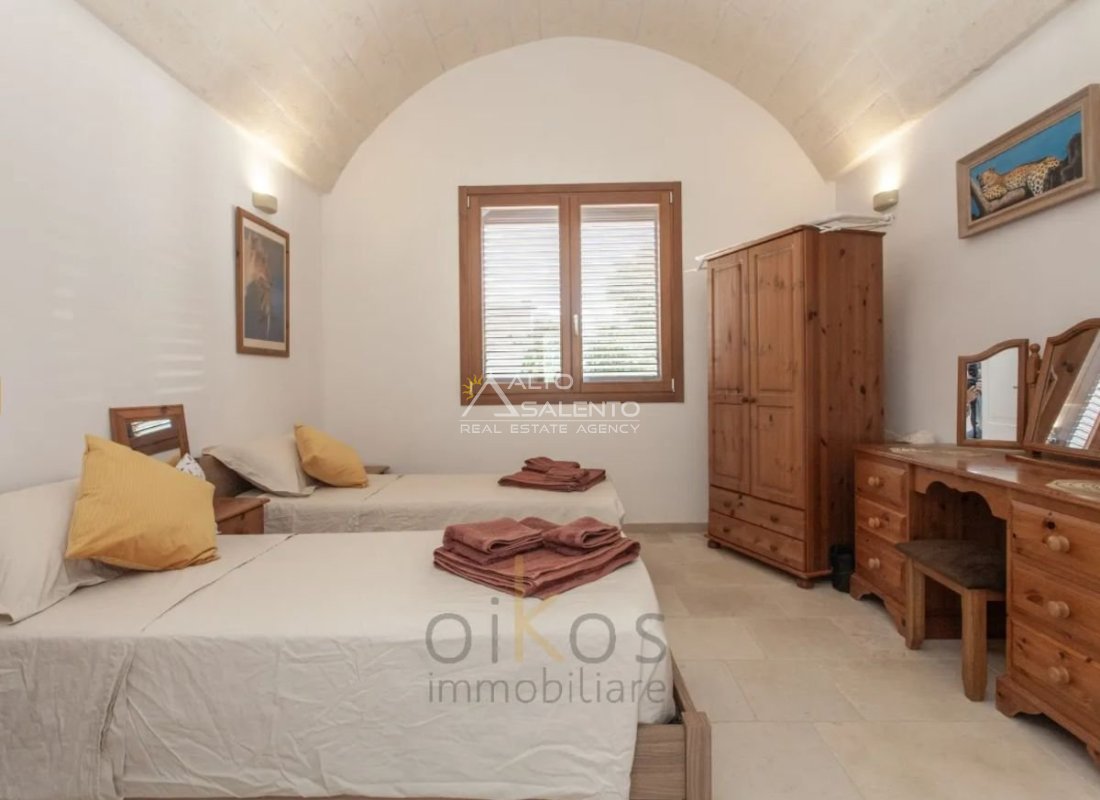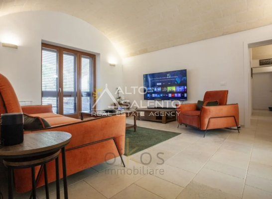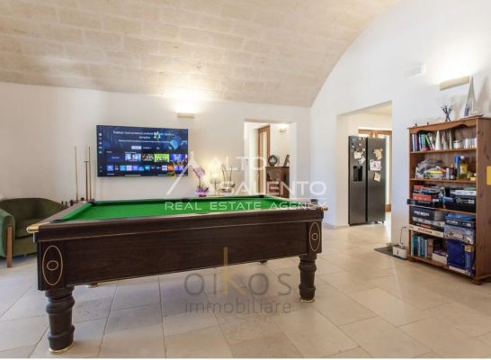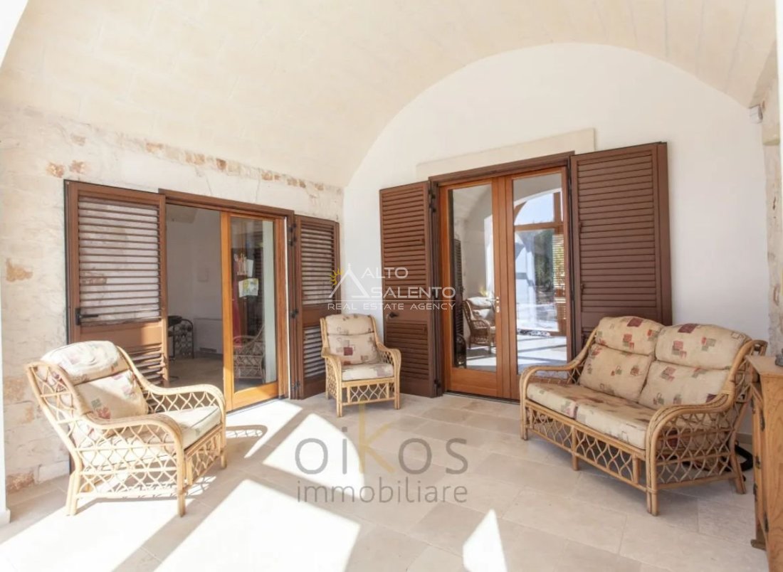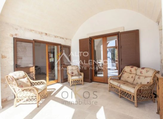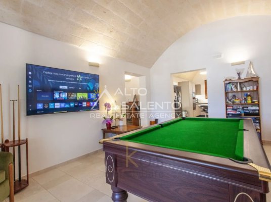 La piscina con area solarium è il cuore della vita estiva, circondata da un giardino mediterraneo con ulivi secolari e profumi di macchia. La veranda coperta ospita una zona pranzo e relax all’aperto, ideale per godere del clima mite del Salento durante tutto l’anno.
