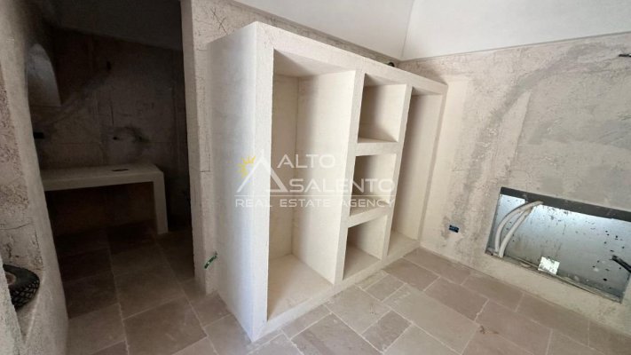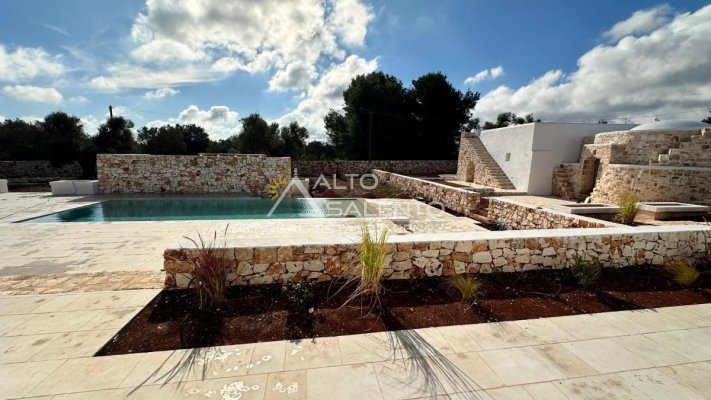 All’esterno, una pergola attrezzata ospita la cucina all’aperto, mentre una seconda area ombreggiata si affaccia sulla splendida piscina privata di circa 40 mq, realizzata in stile infinity pool e incorniciata dalla pietra locale, creando un’atmosfera da resort.