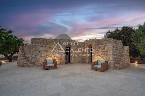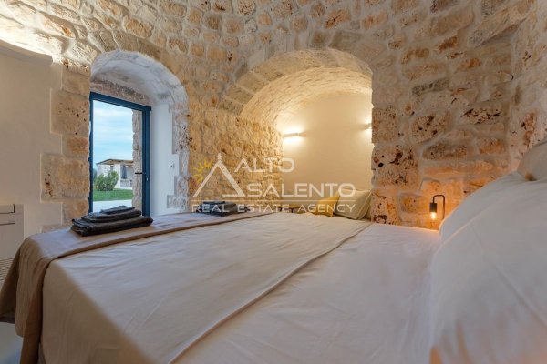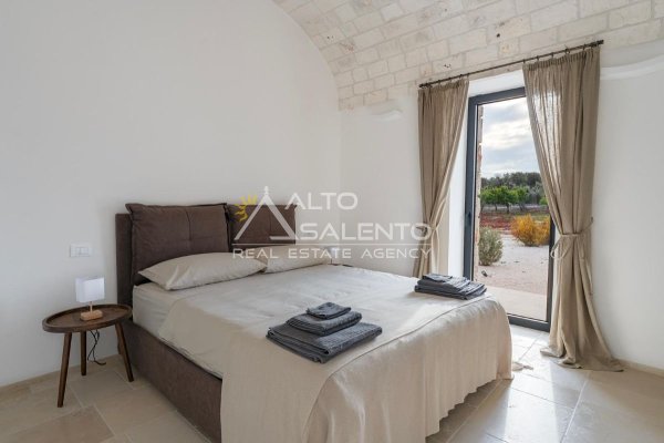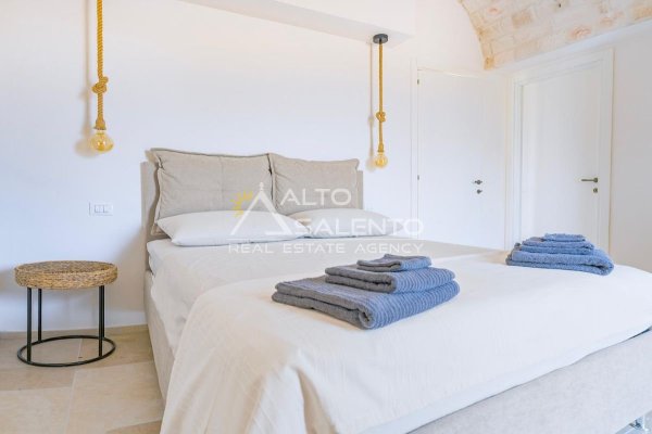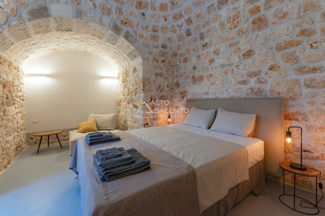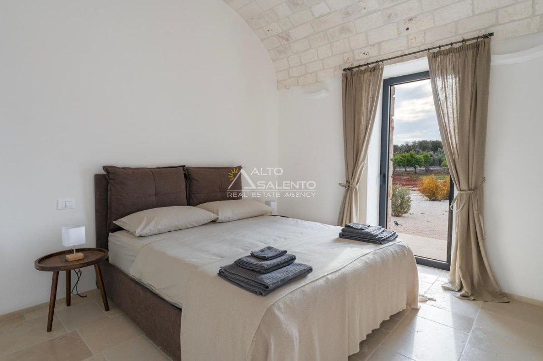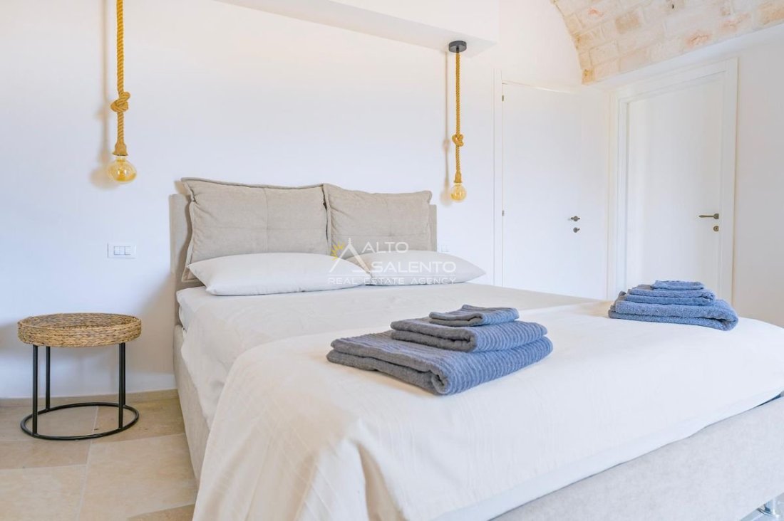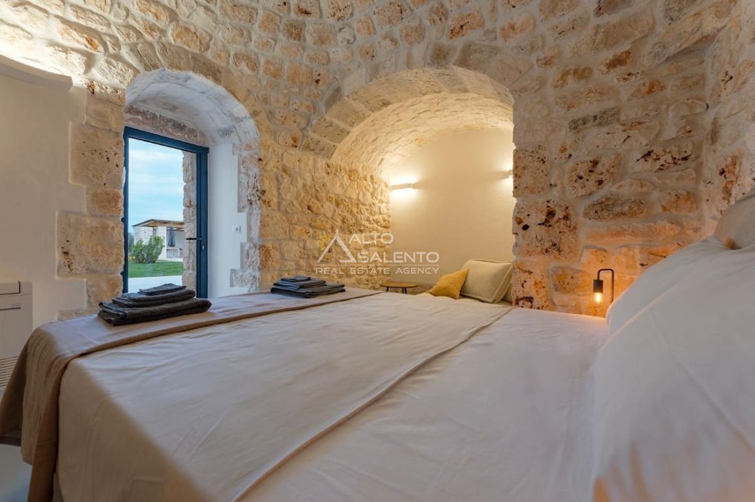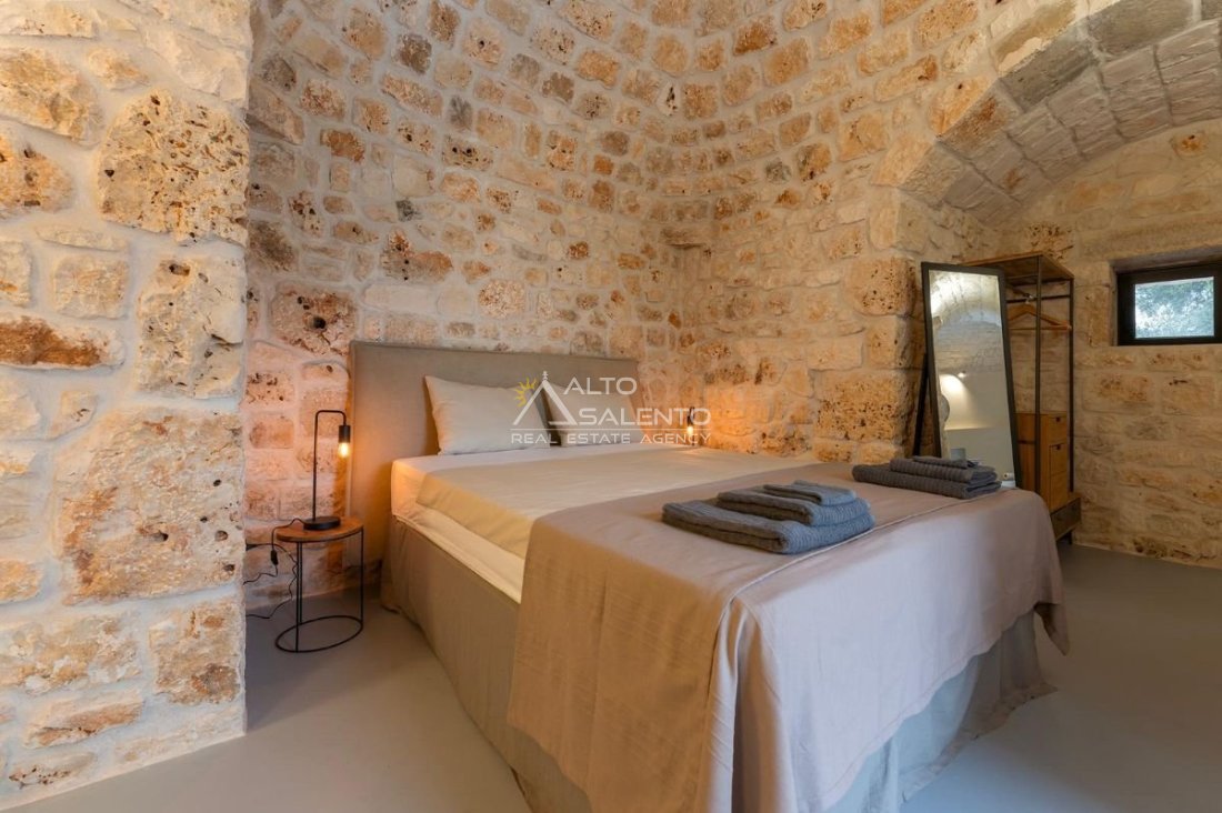 4 camere da letto: tre nell’unità principale con volte a botte e pavimenti in prezioso Trani, una nella dependance con trullo tipico pugliese