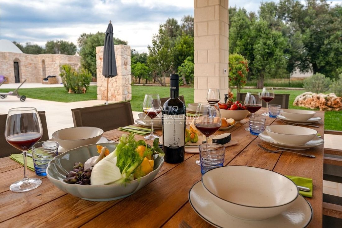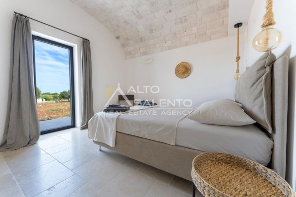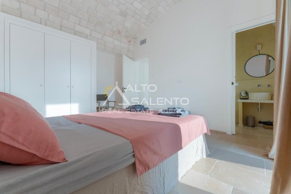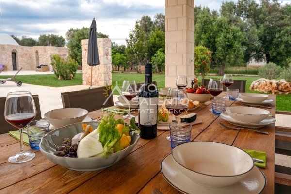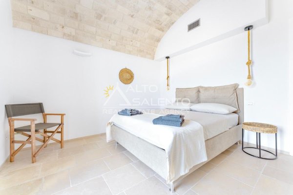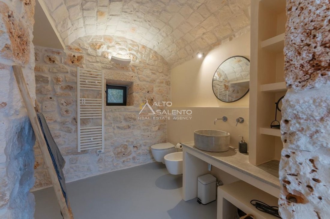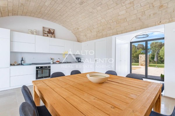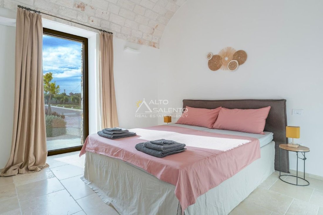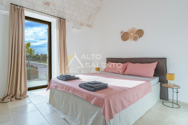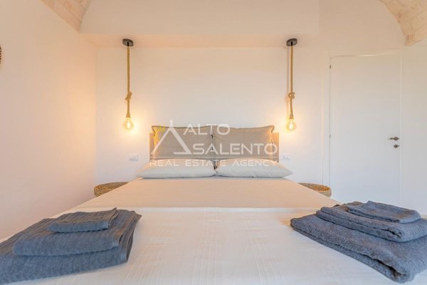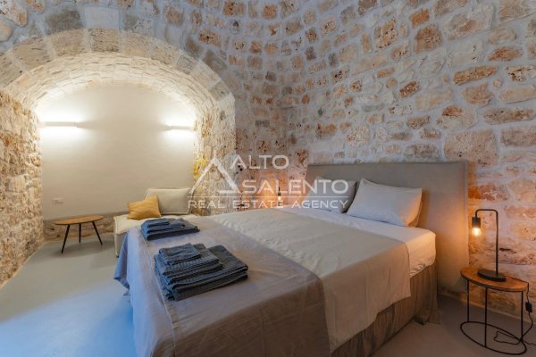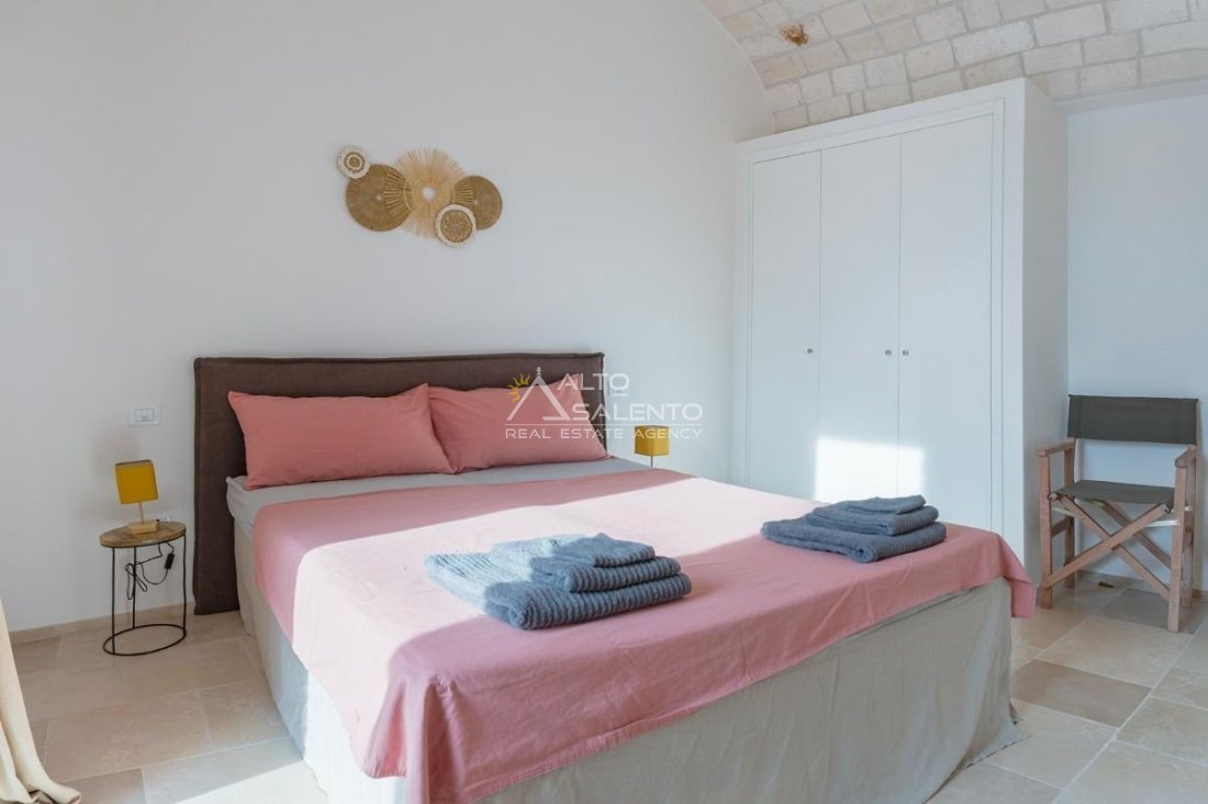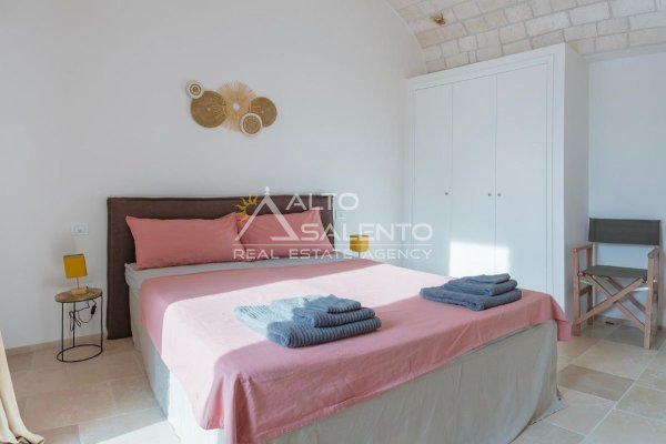 4 camere da letto: tre nell’unità principale con volte a botte e pavimenti in prezioso Trani, una nella dependance con trullo tipico pugliese