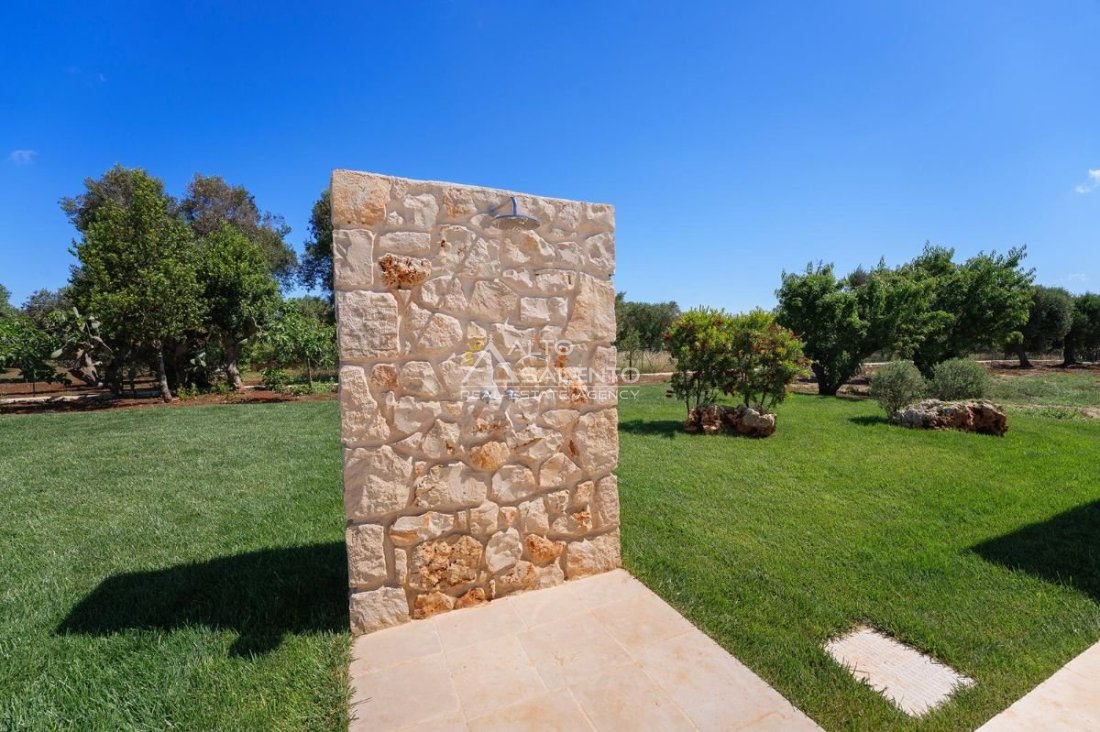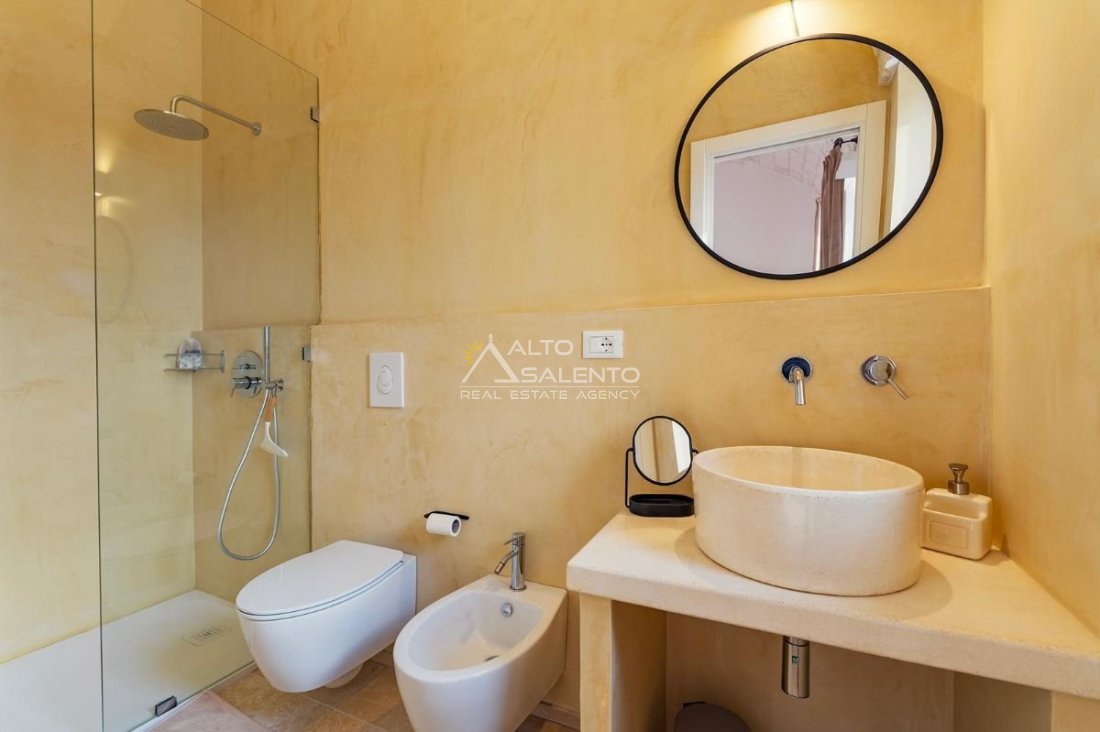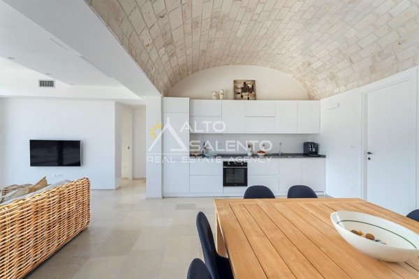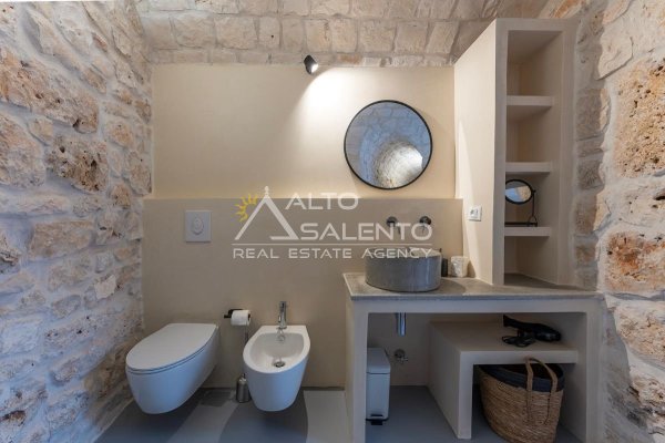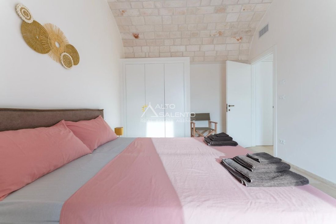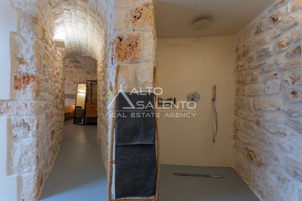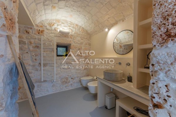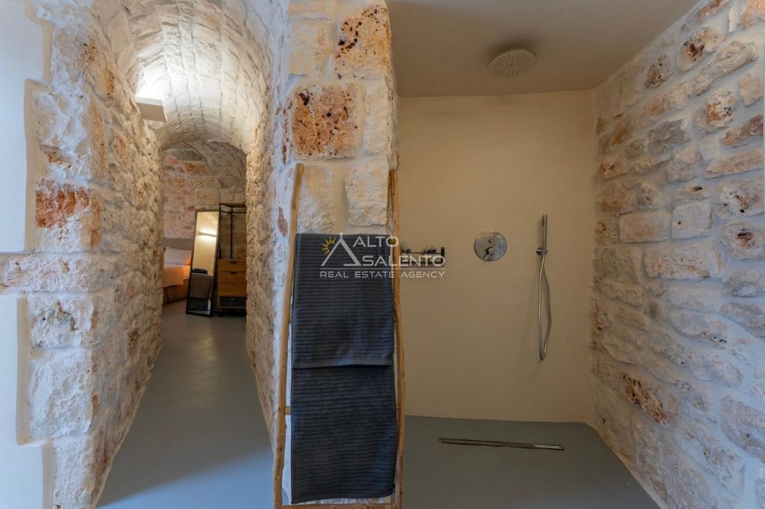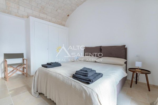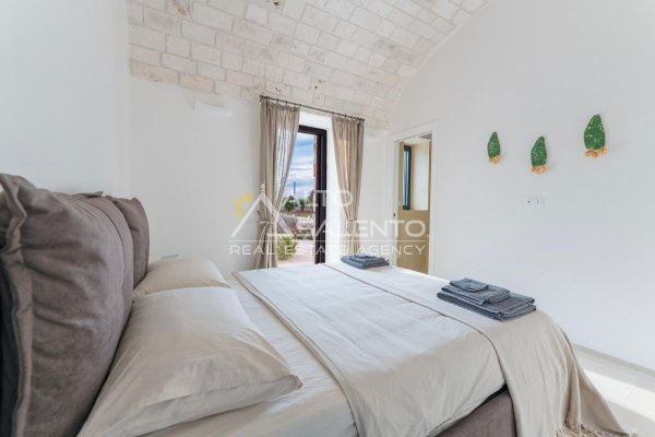 4 camere da letto: tre nell’unità principale con volte a botte e pavimenti in prezioso Trani, una nella dependance con trullo tipico pugliese