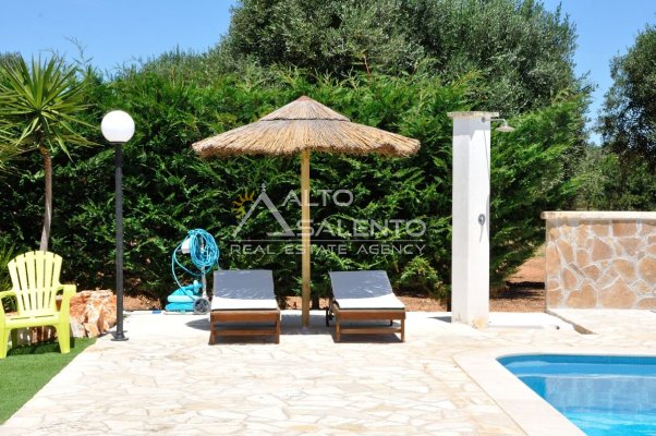 Circondata da 4.500 mq di terreno curato, la villa si trova in una posizione tranquilla e riservata, a breve distanza dai servizi e dalle rinomate spiagge dell’Alto Salento.