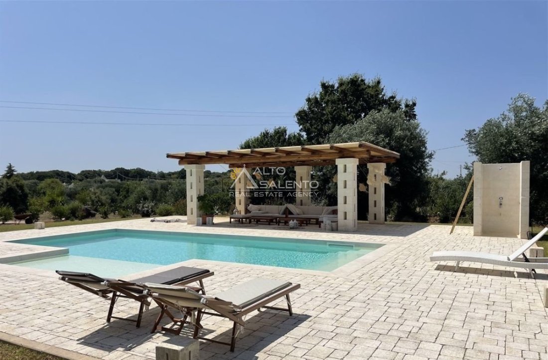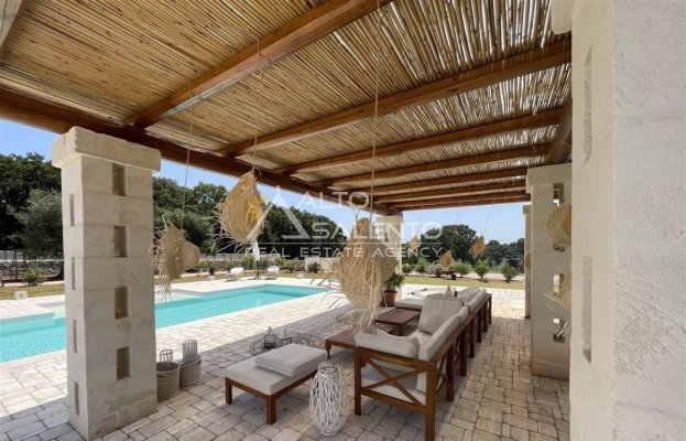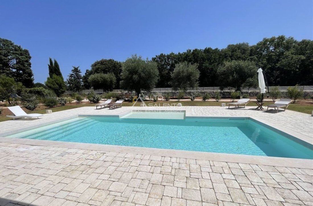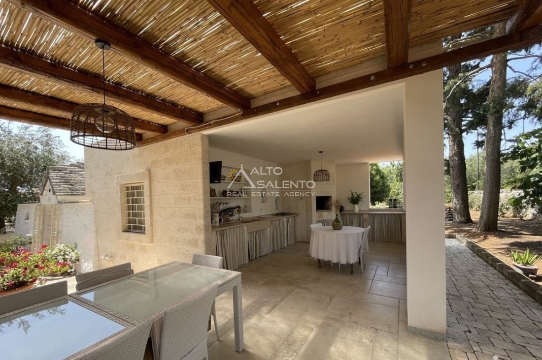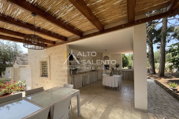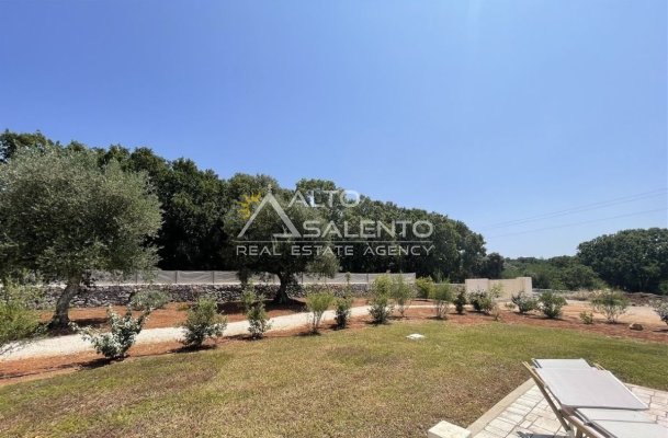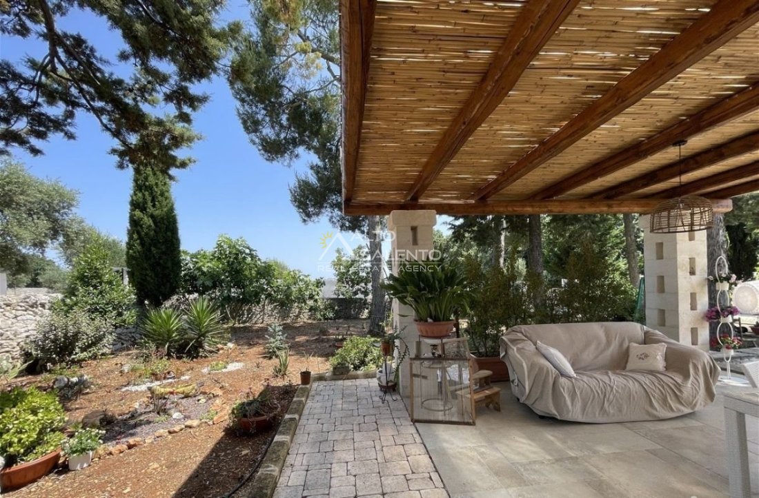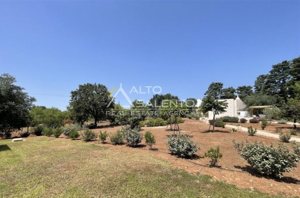 Il terreno di pertinenza si estende per circa 6.000 mq, quasi interamente recintato da muretti a secco e dotato di doppio accesso carrabile, uno dei quali con cancello automatico.