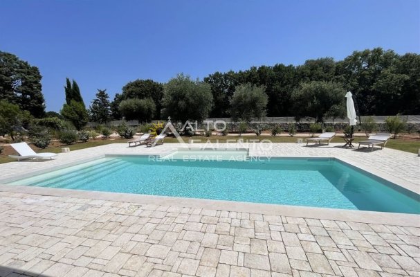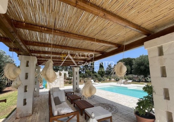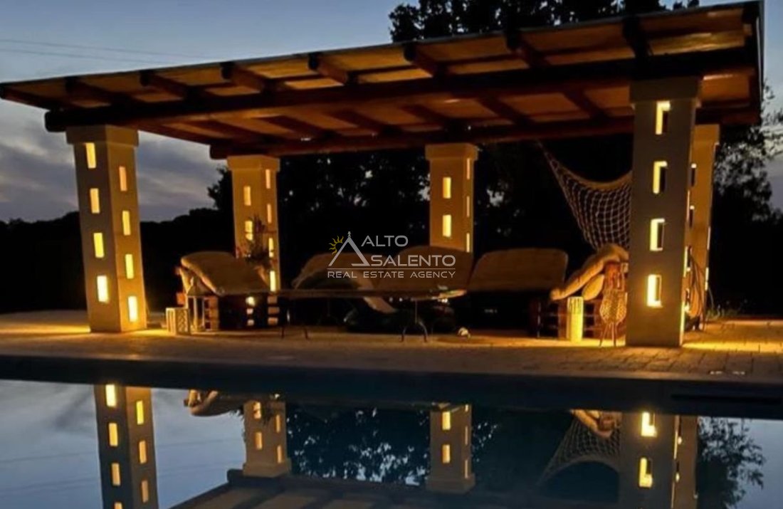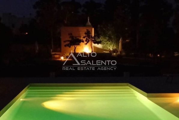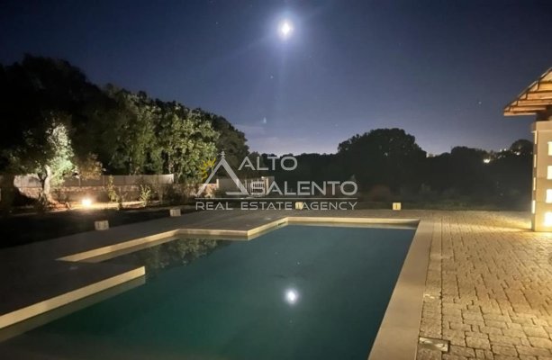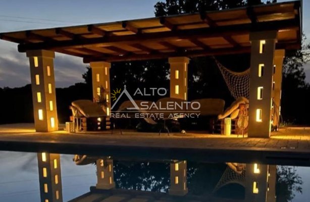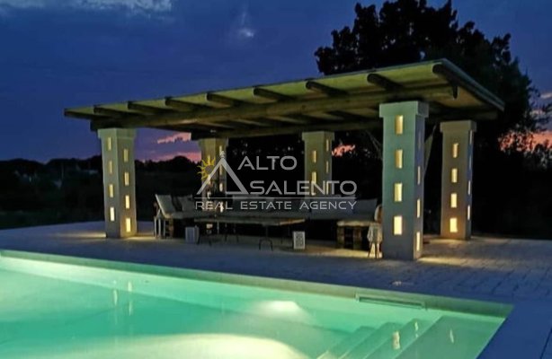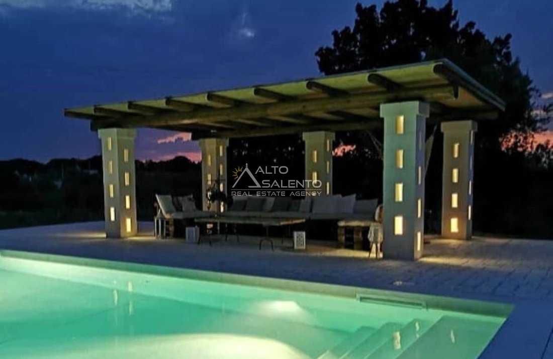 All’esterno, la piscina di 40 mq è circondata da un ampio piazzale e da un pergolato con colonne illuminate, perfetto per vivere momenti di relax al tramonto.