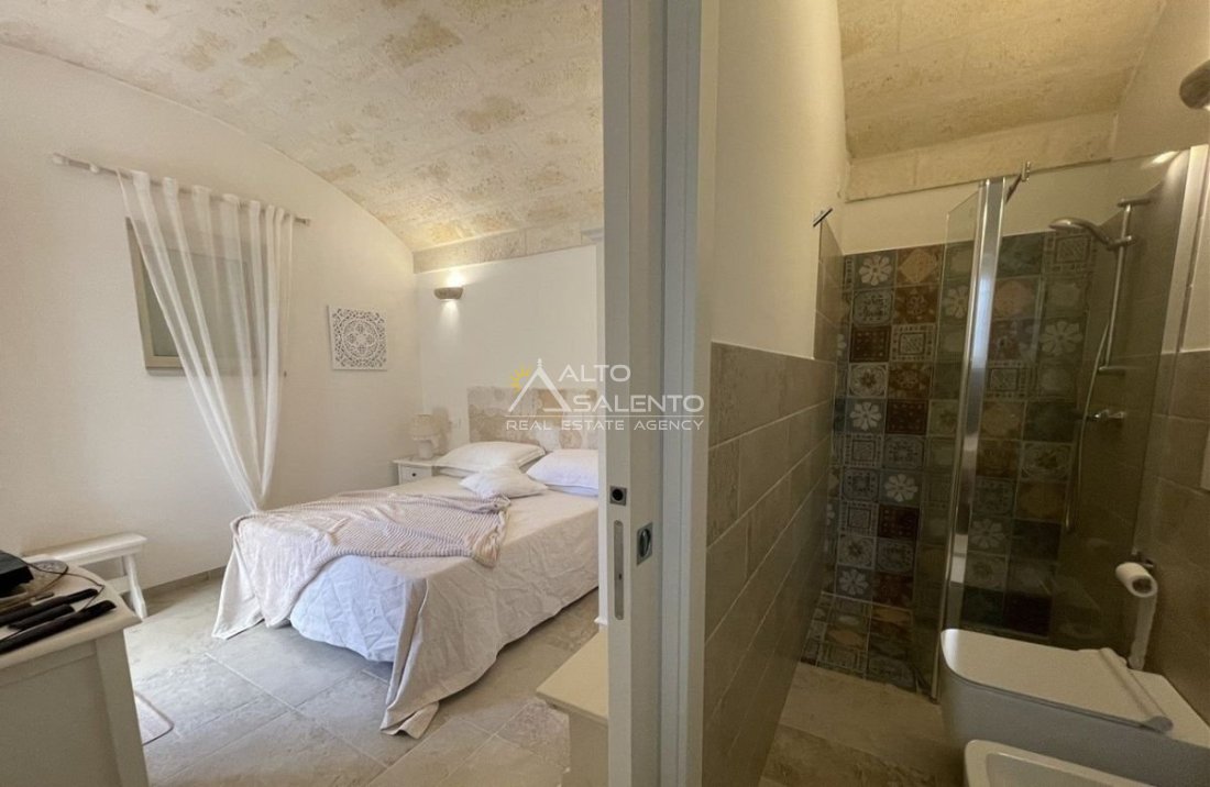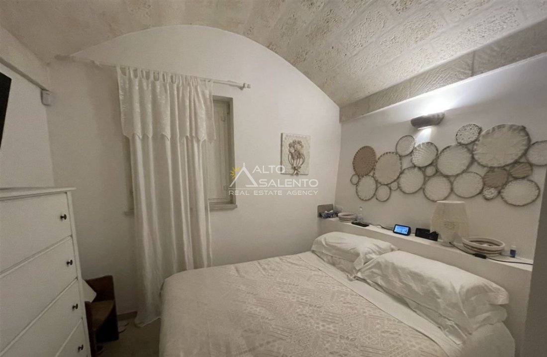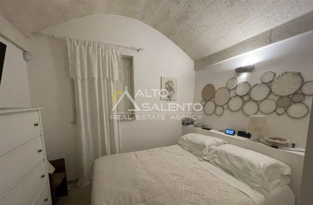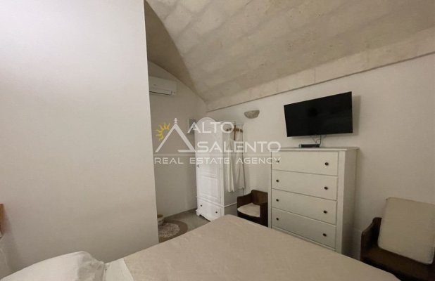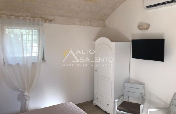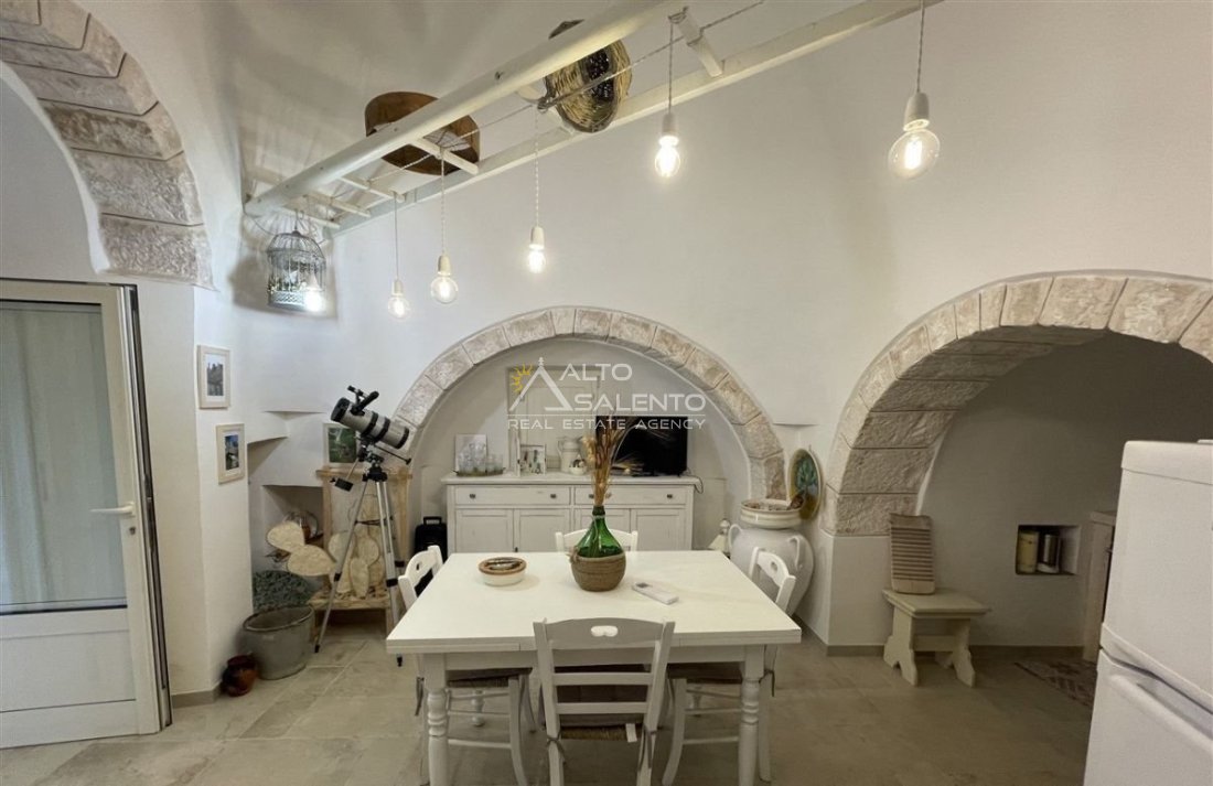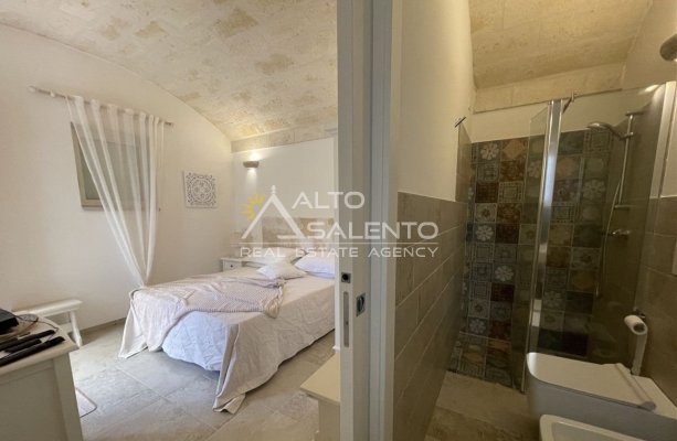 Ricavata all’interno di autentici trulli pugliesi, la dimora principale accoglie una zona giorno con sala da pranzo e angolo cottura in muratura, elegantemente collocato in un’alcova. Un disimpegno conduce alla camera da letto matrimoniale e al bagno, finemente rifinito e funzionale.