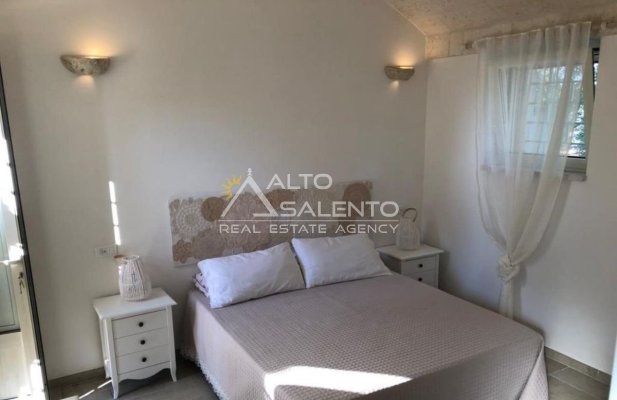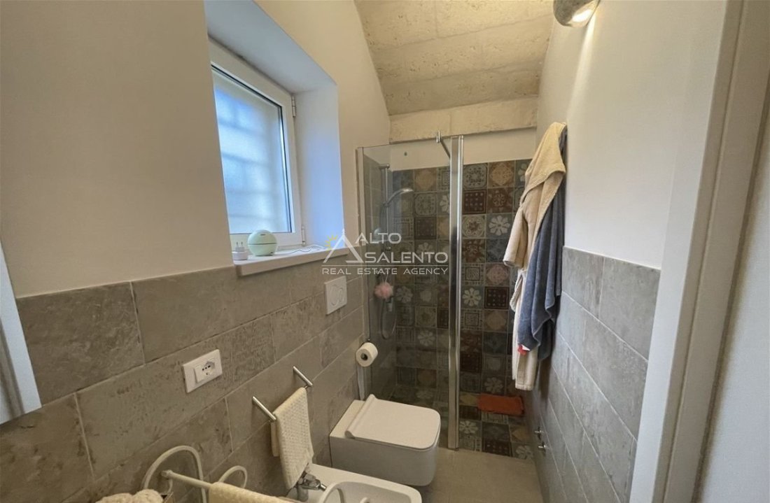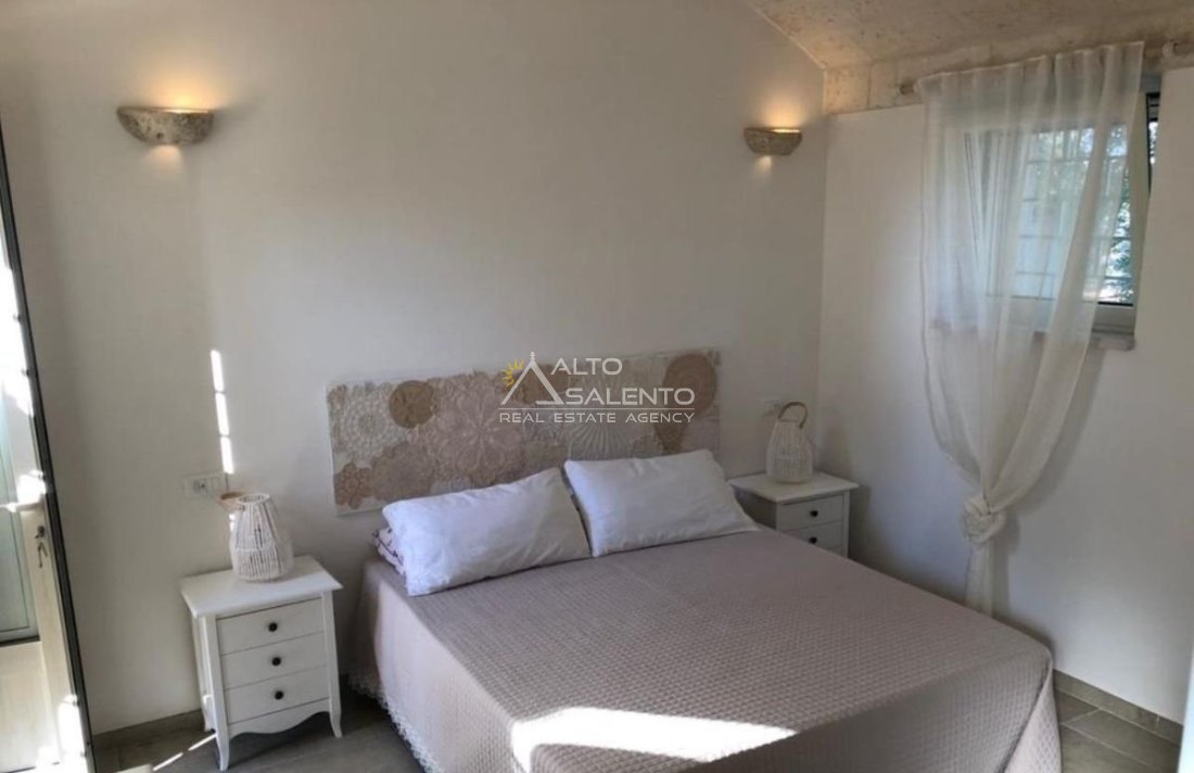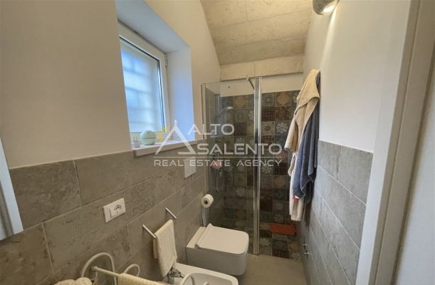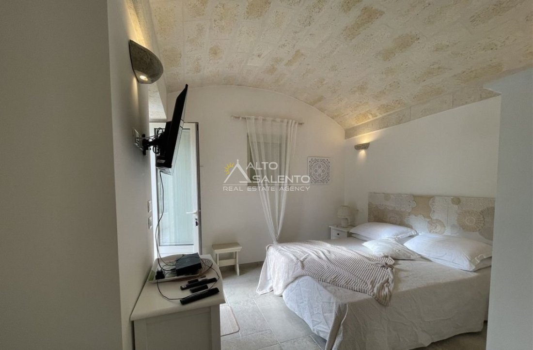Ricavata all’interno di autentici trulli pugliesi, la dimora principale accoglie una zona giorno con sala da pranzo e angolo cottura in muratura, elegantemente collocato in un’alcova. Un disimpegno conduce alla camera da letto matrimoniale e al bagno, finemente rifinito e funzionale.