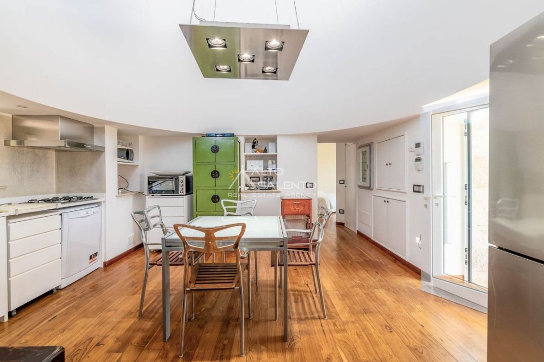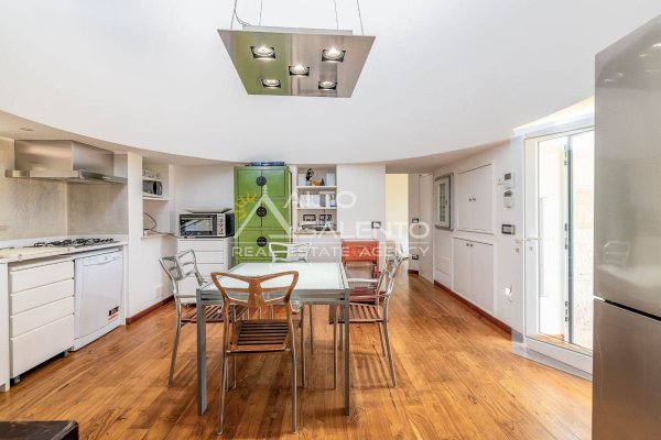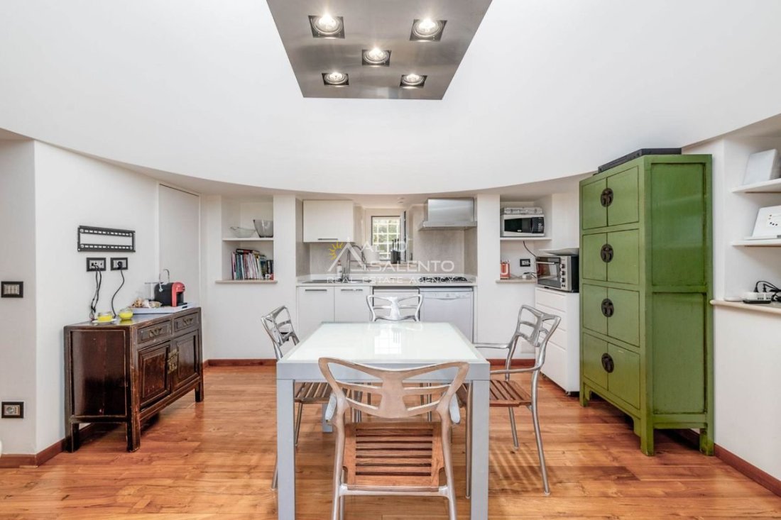 Ampio soggiorno con suggestivo piano cottura ricavato nel trullo, elemento architettonico autentico e di grande fascino;