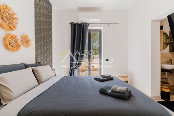 Il dialogo armonioso tra superfici bianche, elementi in pietra e vegetazione circostante crea un’atmosfera autentica e rilassante.