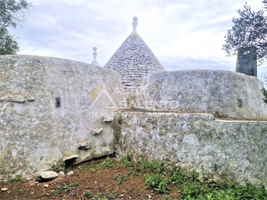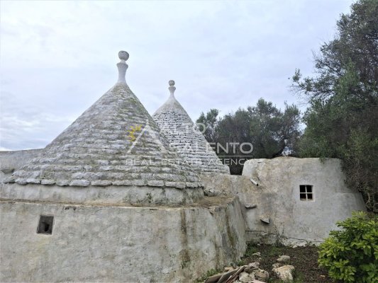 Il corpo principale si distingue per la presenza di due coni, di cui uno particolarmente alto, che dona alla proprietà un profilo elegante e riconoscibile. Ad arricchire la struttura vi sono due trulli Saraceni, riconoscibili dalla tipica forma arrotondata, elementi di grande valore storico che conferiscono ulteriore autenticità e fascino all’intero complesso.