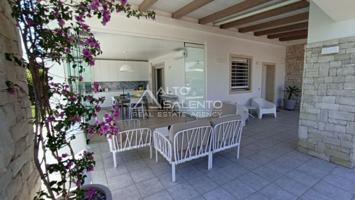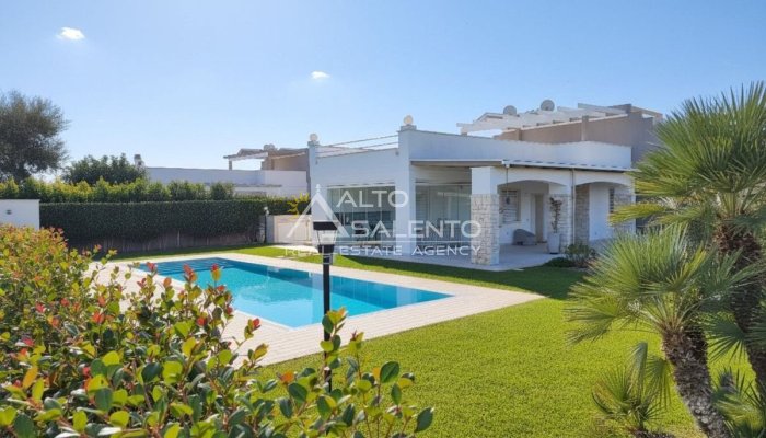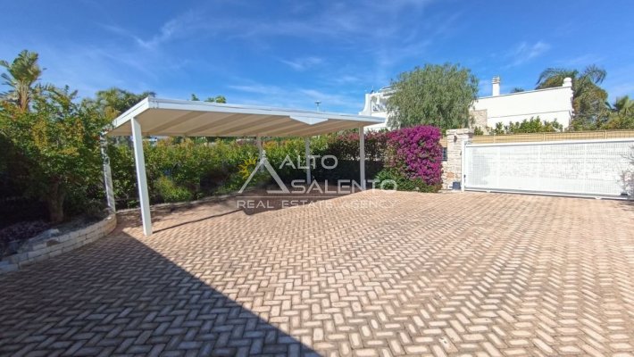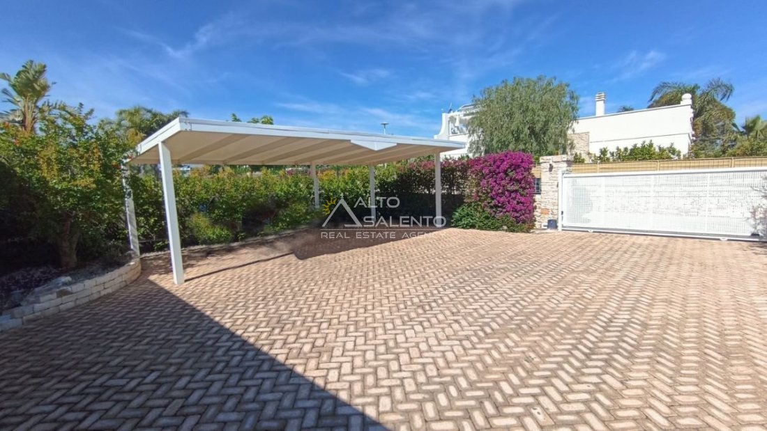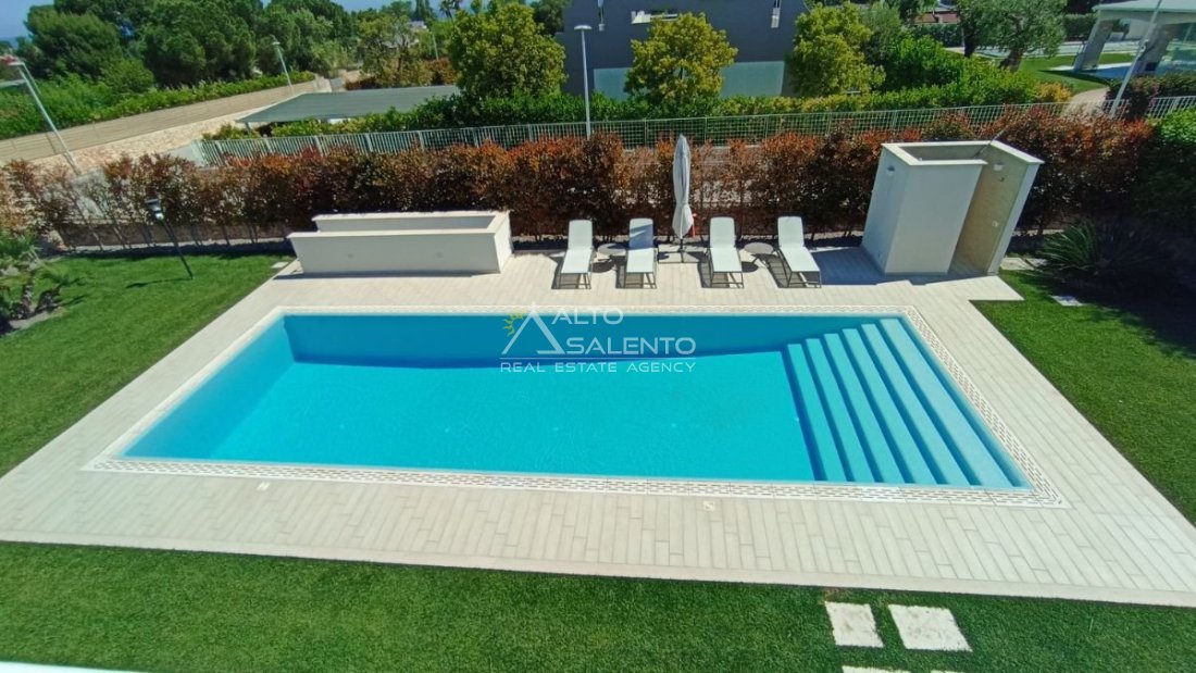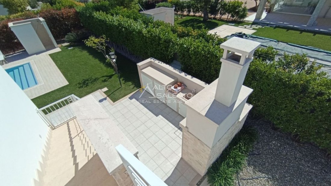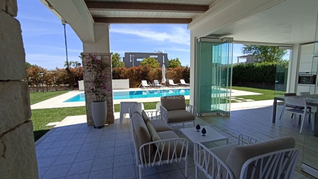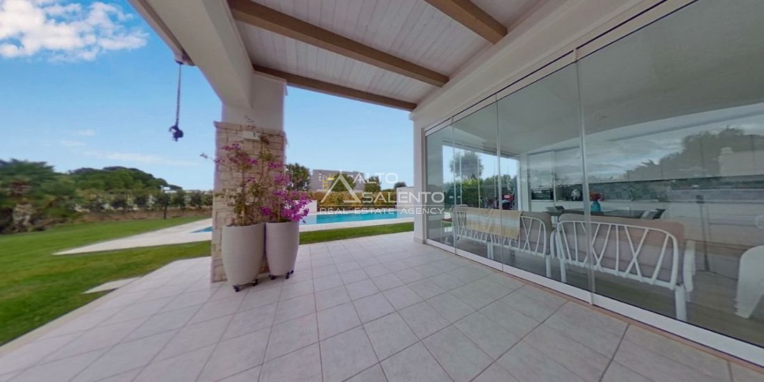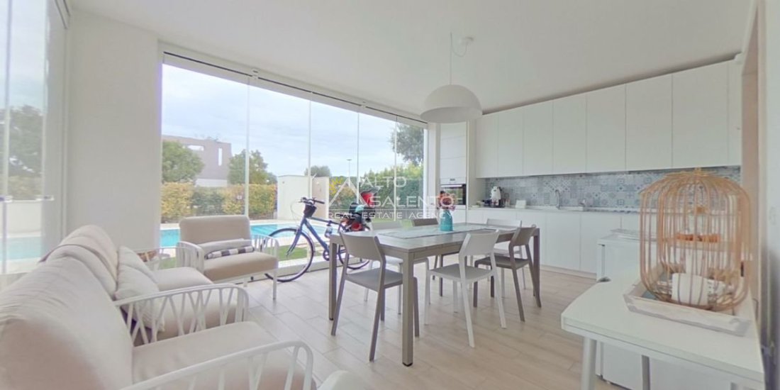 Un patio verandato introduce all’abitazione e conduce sia alla zona giorno sia a una veranda attrezzata con cucina, affacciata sul verde e sulla piscina esclusiva, vero punto focale degli spazi outdoor.