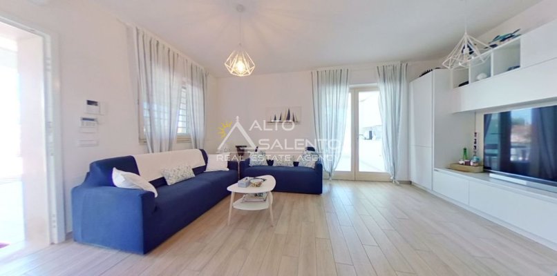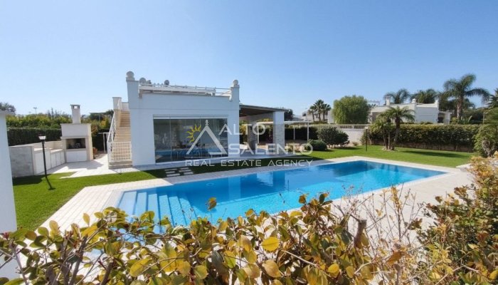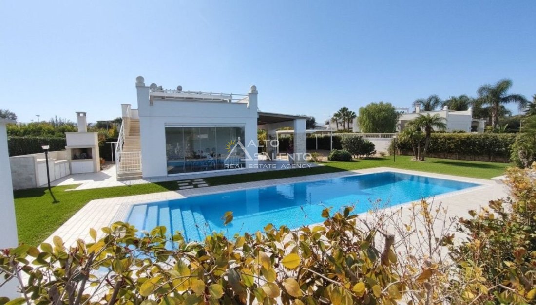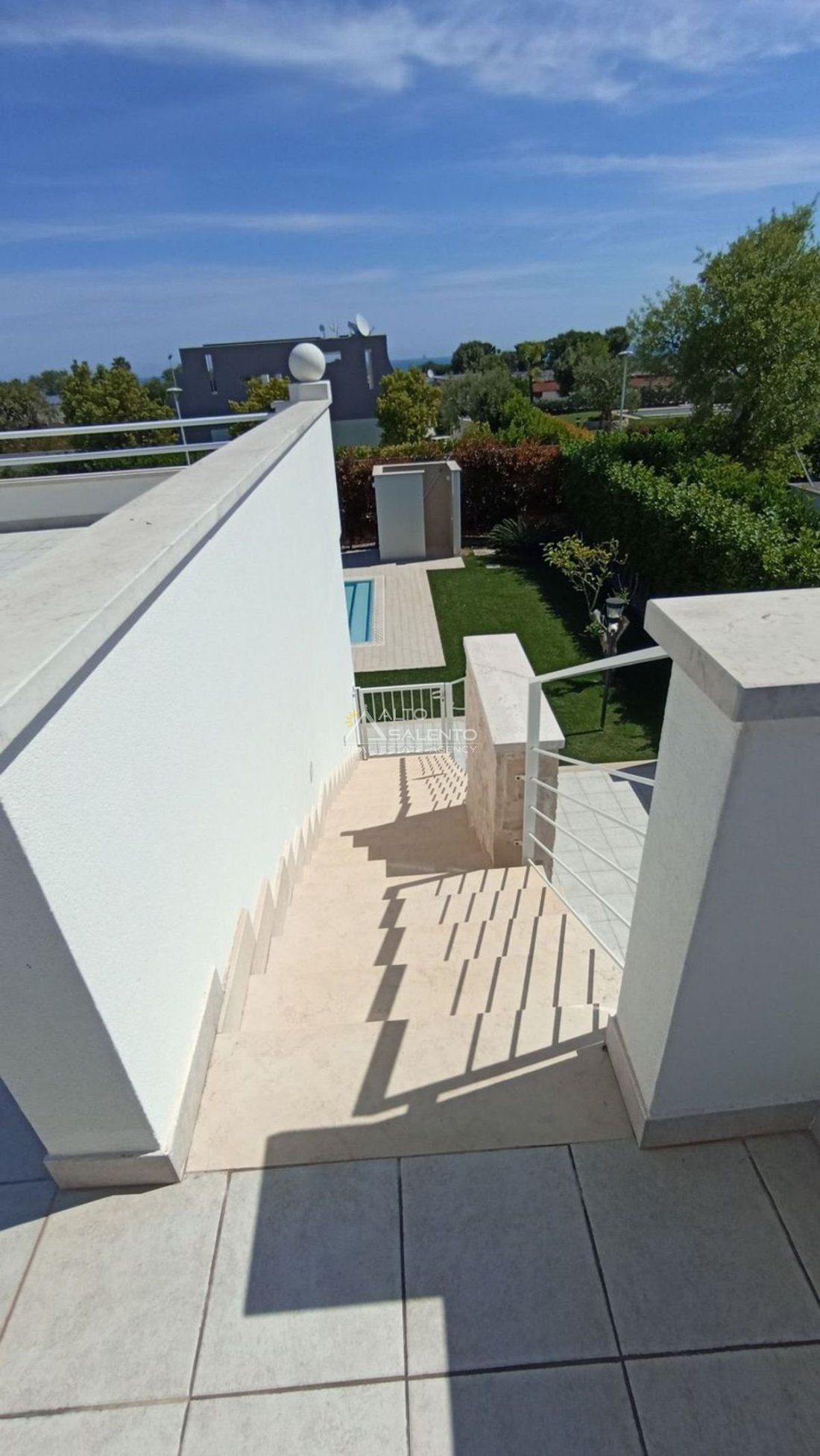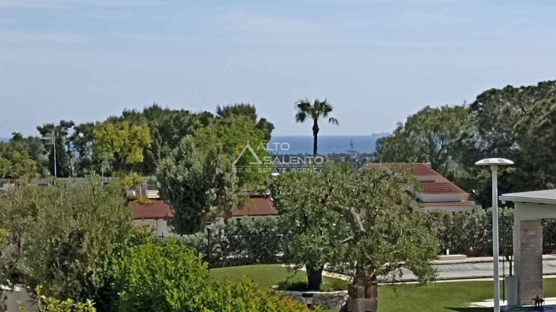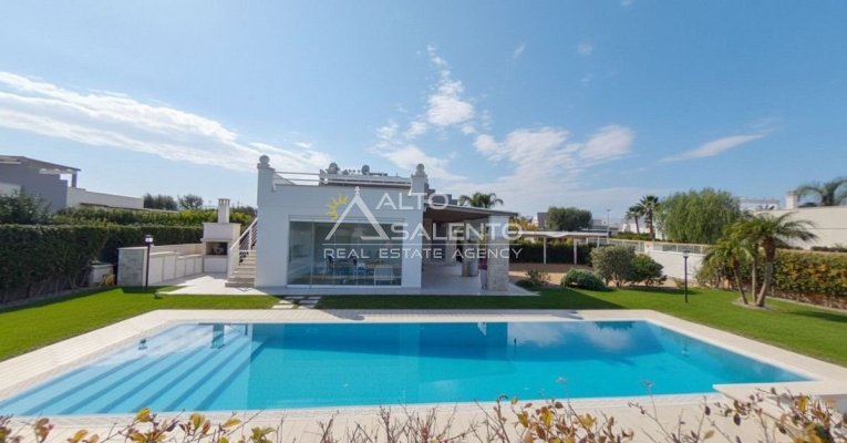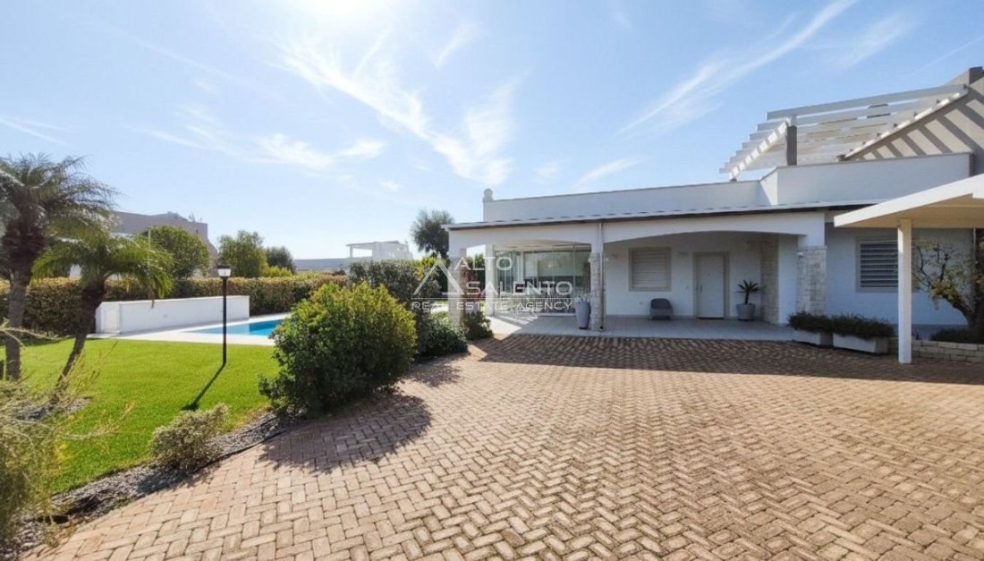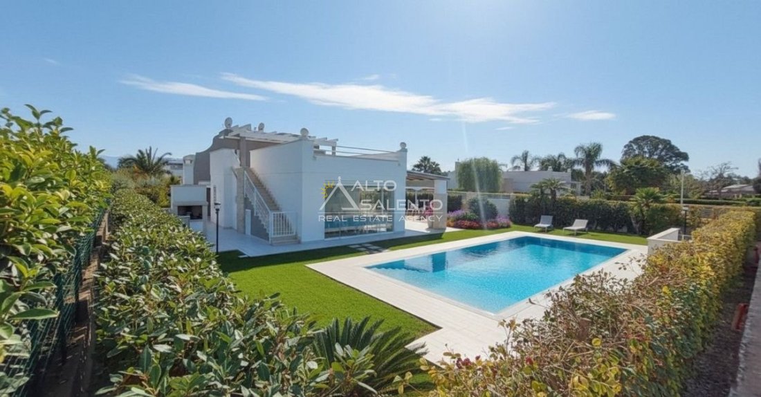 Un patio verandato introduce all’abitazione e conduce sia alla zona giorno sia a una veranda attrezzata con cucina, affacciata sul verde e sulla piscina esclusiva, vero punto focale degli spazi outdoor.