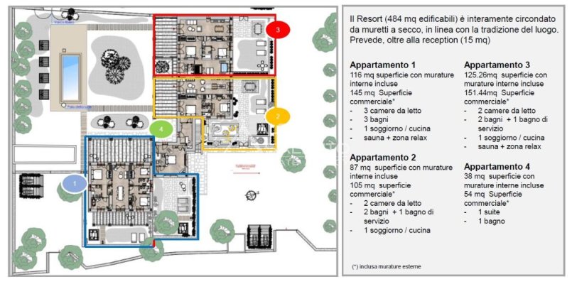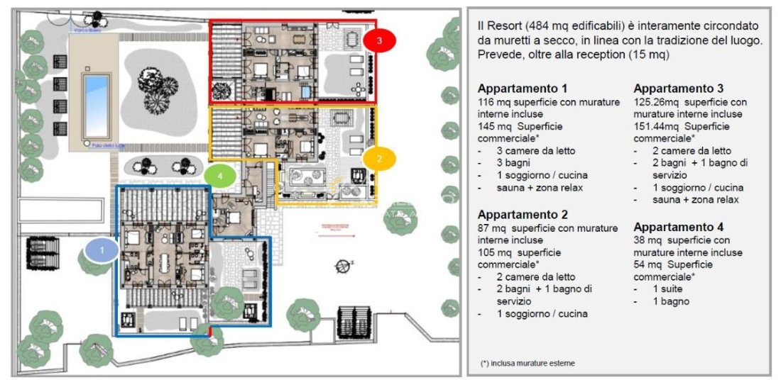 Il progetto interessa un’area complessiva di circa 3 ettari e prevede la realizzazione di un complesso residenziale turistico esclusivo, composto da 3 appartamenti indipendenti e 1 suite accessibile, per una superficie edificabile totale di 484 mq. L’intero resort sarà delimitato da muretti a secco, in continuità con la tradizione architettonica locale.
