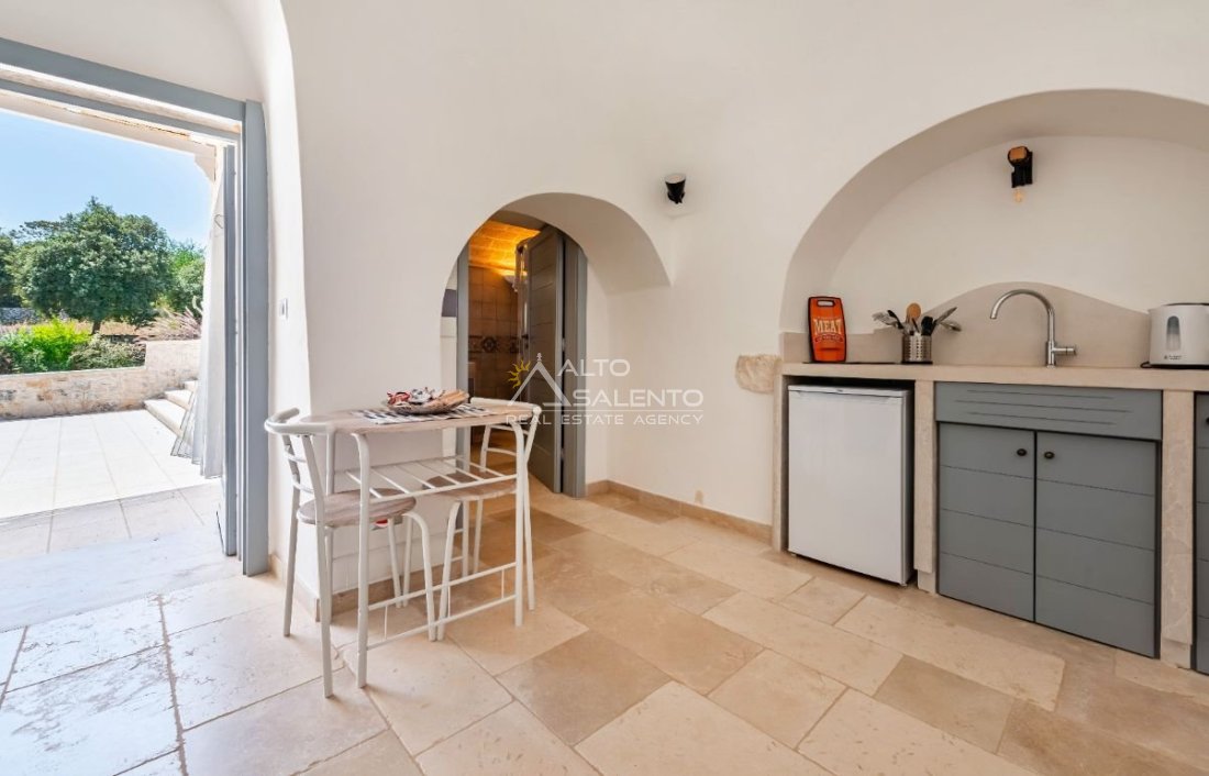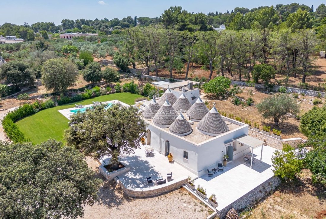Muretti a secco magistralmente recuperati dai maestri trullari, che delimitano la proprietà con eleganza e rigore storico.