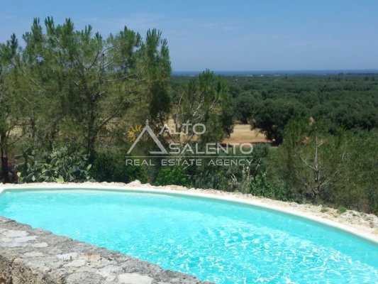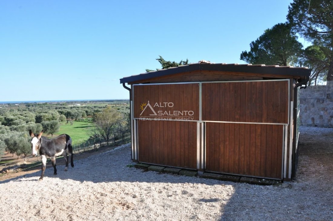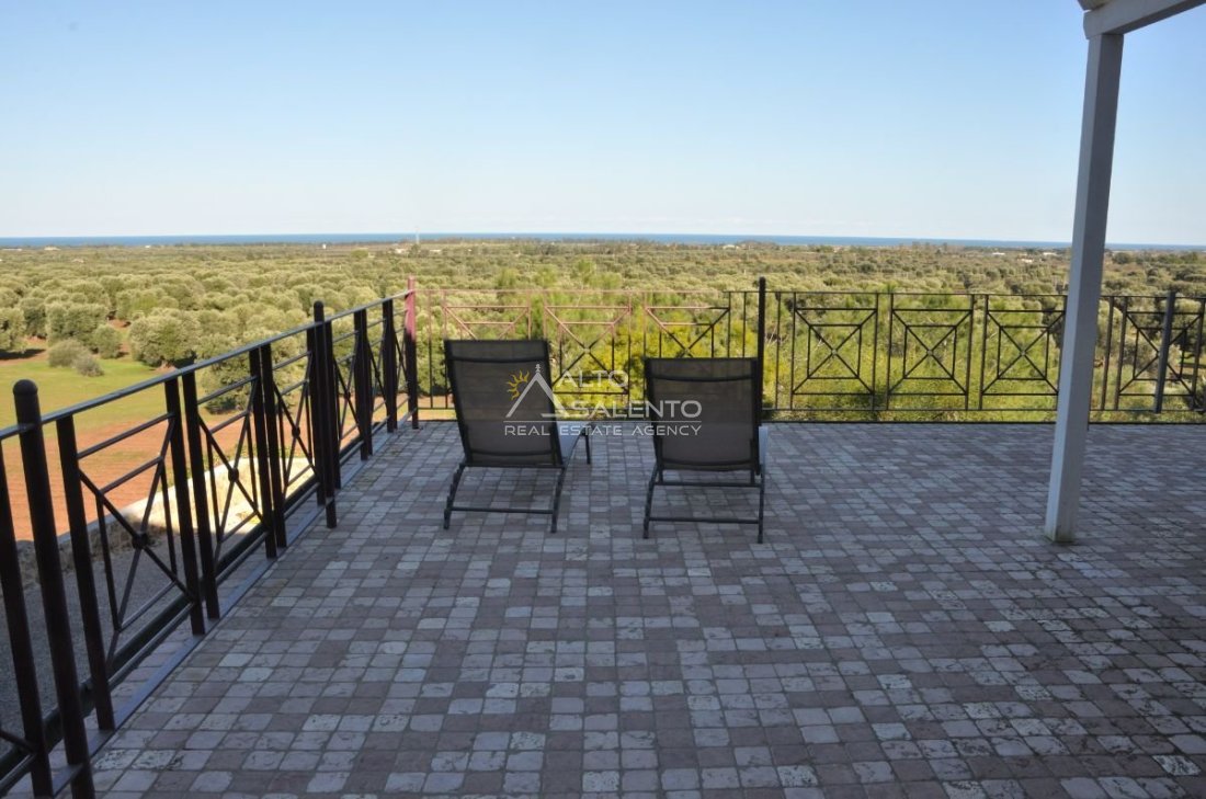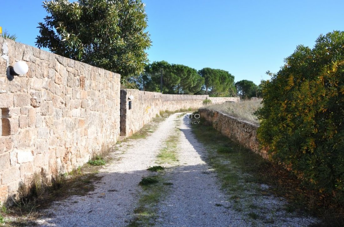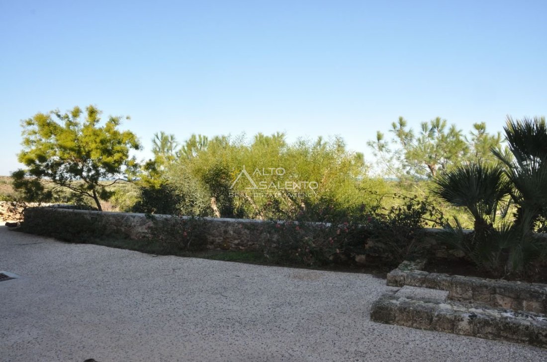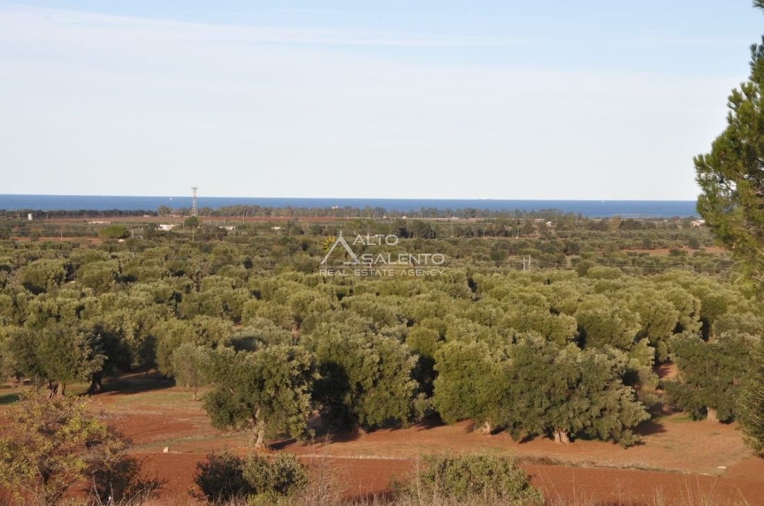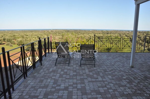 La proprietà si estende su circa tre ettari di terreno, impreziositi da 115 ulivi secolari, seminativo e numerosi alberi da frutto, offrendo un contesto di assoluta privacy e un forte legame con il paesaggio rurale pugliese. La villa è adagiata su un naturale dislivello che crea terrazze panoramiche da cui si gode una vista suggestiva verso il mare e la campagna brindisina, un quadro autentico fatto di ulivi e macchia mediterranea.