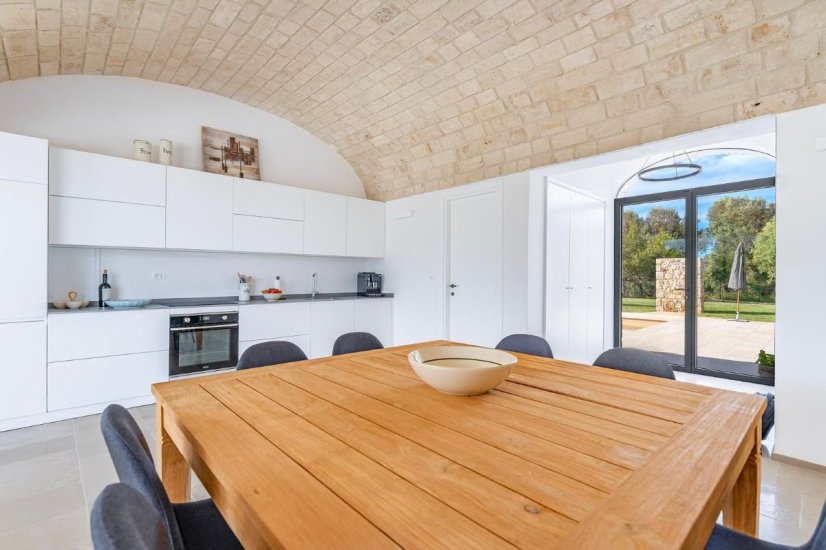 4 camere da letto: tre nell’unità principale con volte a botte e pavimenti in prezioso Trani, una nella dependance con trullo tipico pugliese