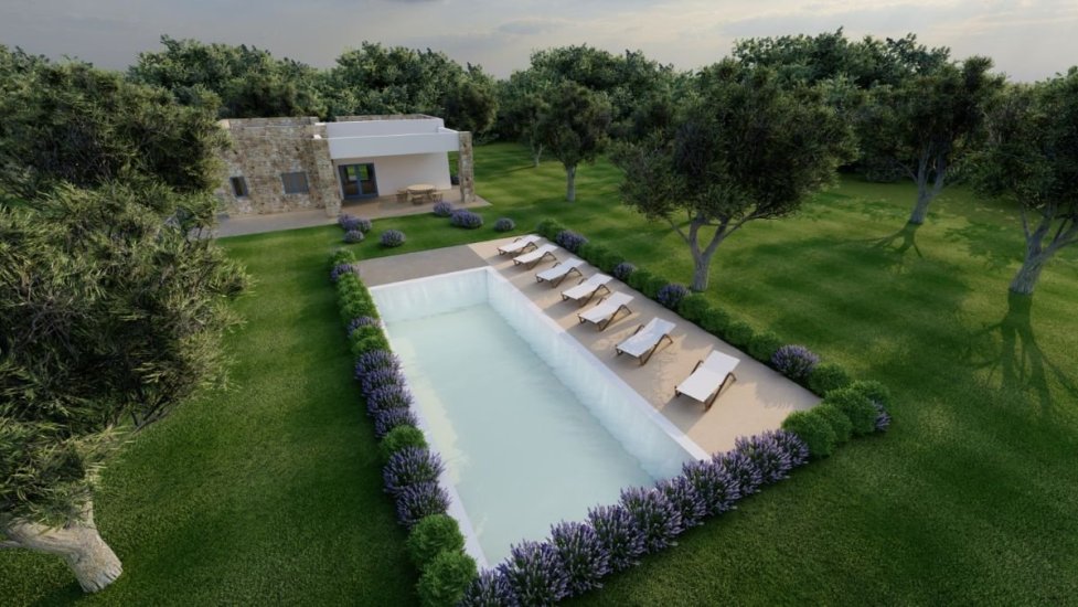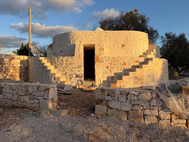 La villa con volte a stella e a botte, si sviluppa su un unico livello ed è composta da soggiorno, tre camere da letto e tre bagni, con distribuzione funzionale degli ambienti. La zona cucina è collocata all’interno di una veranda chiusa con vetrate, integrata strutturalmente all’abitazione e dotata di pavimento riscaldato. Le finiture interne ed esterne sono realizzate con materiali lapidei naturali. La pavimentazione è in Pietra di Trani formato 40 cm, utilizzata in continuità tra interno ed esterno. I rivestimenti...