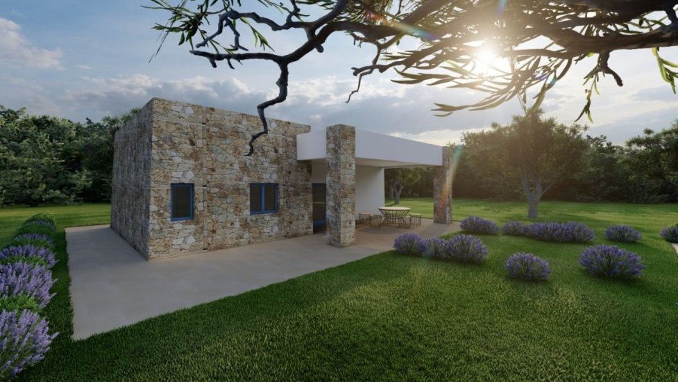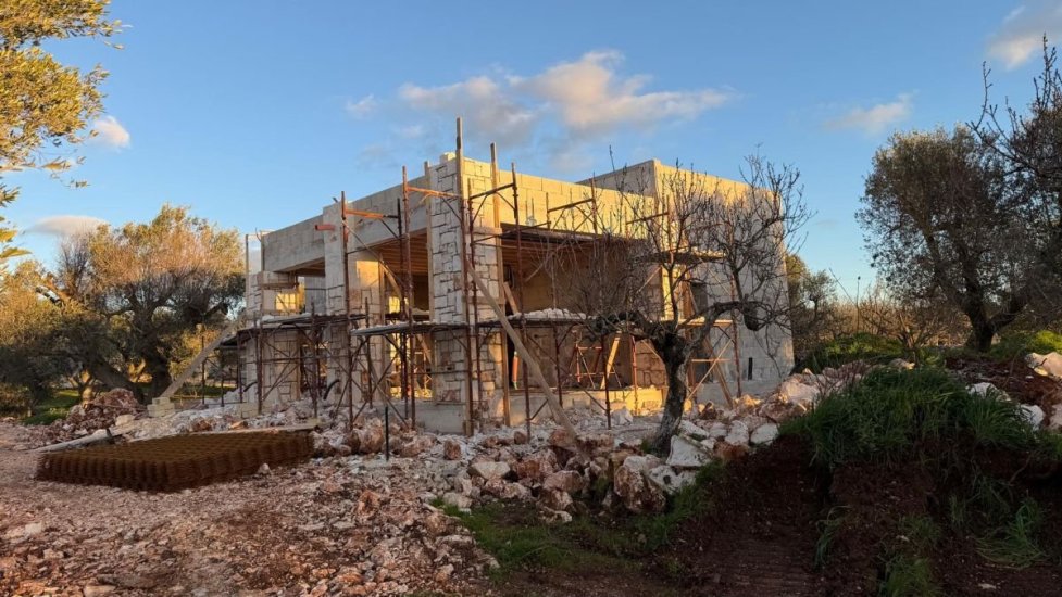 La villa con volte a stella e a botte, si sviluppa su un unico livello ed è composta da soggiorno, tre camere da letto e tre bagni, con distribuzione funzionale degli ambienti. La zona cucina è collocata all’interno di una veranda chiusa con vetrate, integrata strutturalmente all’abitazione e dotata di pavimento riscaldato. Le finiture interne ed esterne sono realizzate con materiali lapidei naturali. La pavimentazione è in Pietra di Trani...