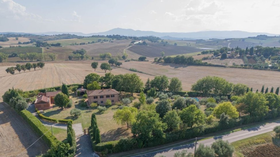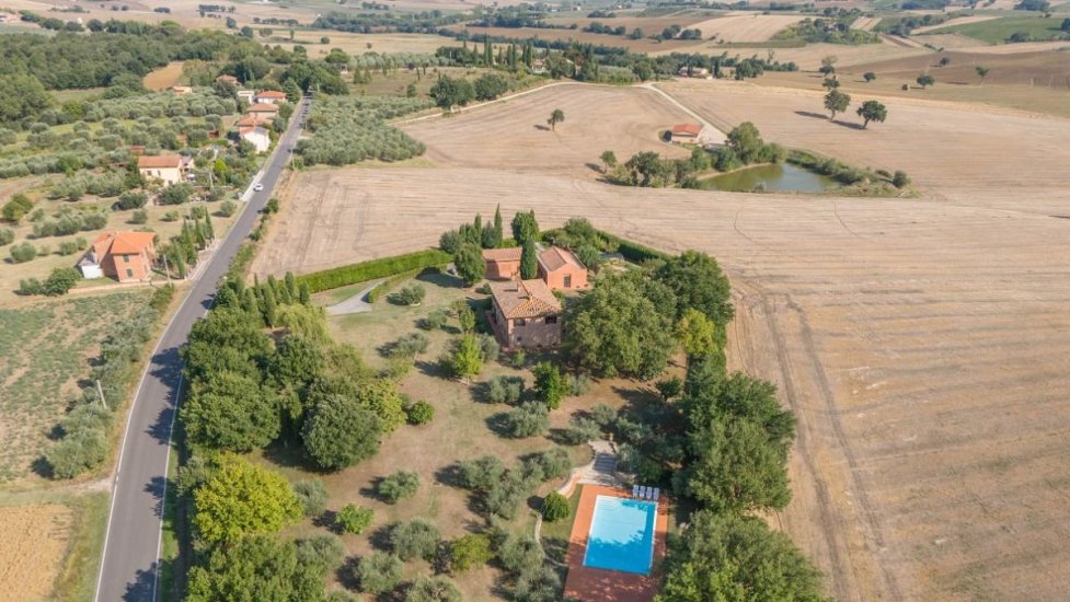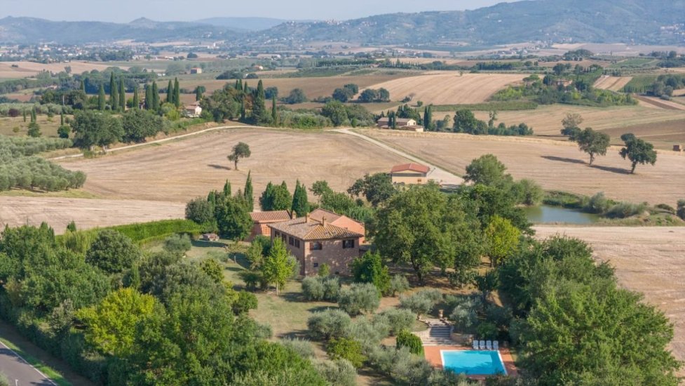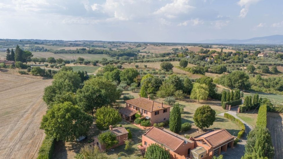 Complesso immobiliare al confine tra Umbria e Toscana con vista sul Lago Trasimeno, inserito in posizione panoramica dominante sulla campagna circostante. La proprietà è composta da casale principale, annesso indipendente, garage, piscina infinity e parco privato, configurandosi come soluzione residenziale di ampia metratura con pertinenze autonome.